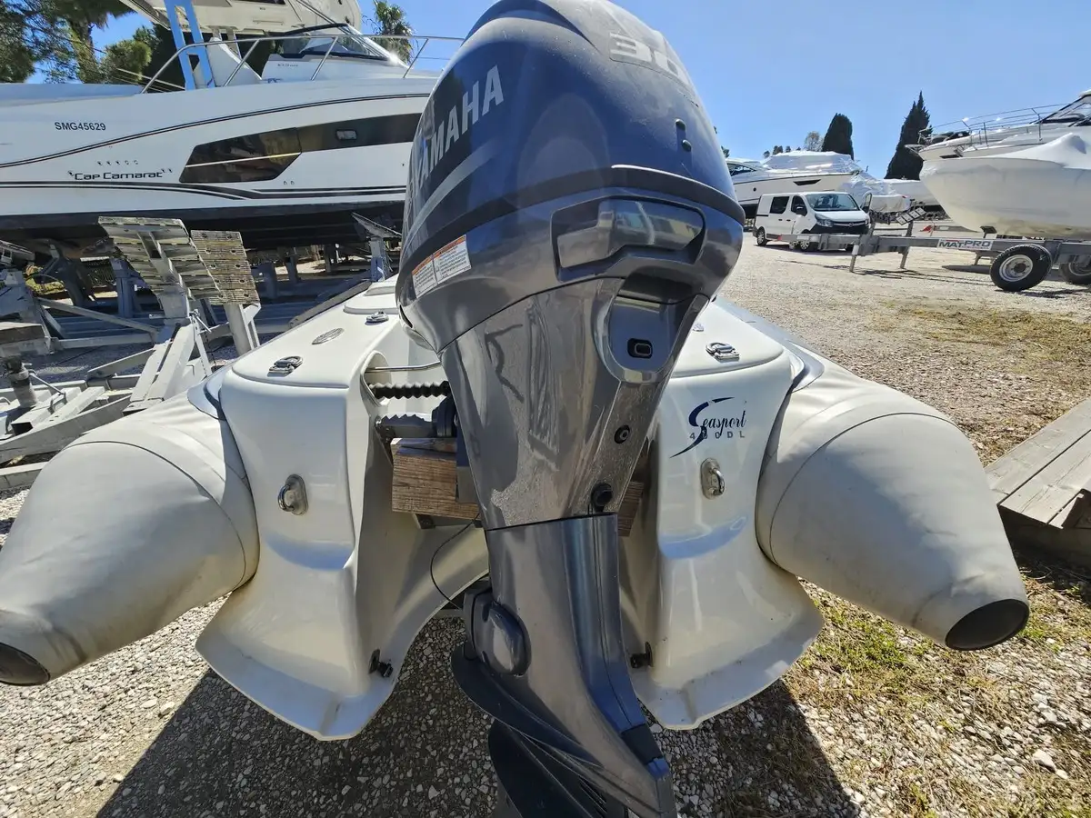 Annexe semi-rigide Avon Seasport 400 DL (série Deluxe), idéale pour servir d'annexe de yacht ou pour des sorties à la journée. Ce modèle est réputé pour sa robustesse, son confort et sa tenue de mer exceptionnelle.