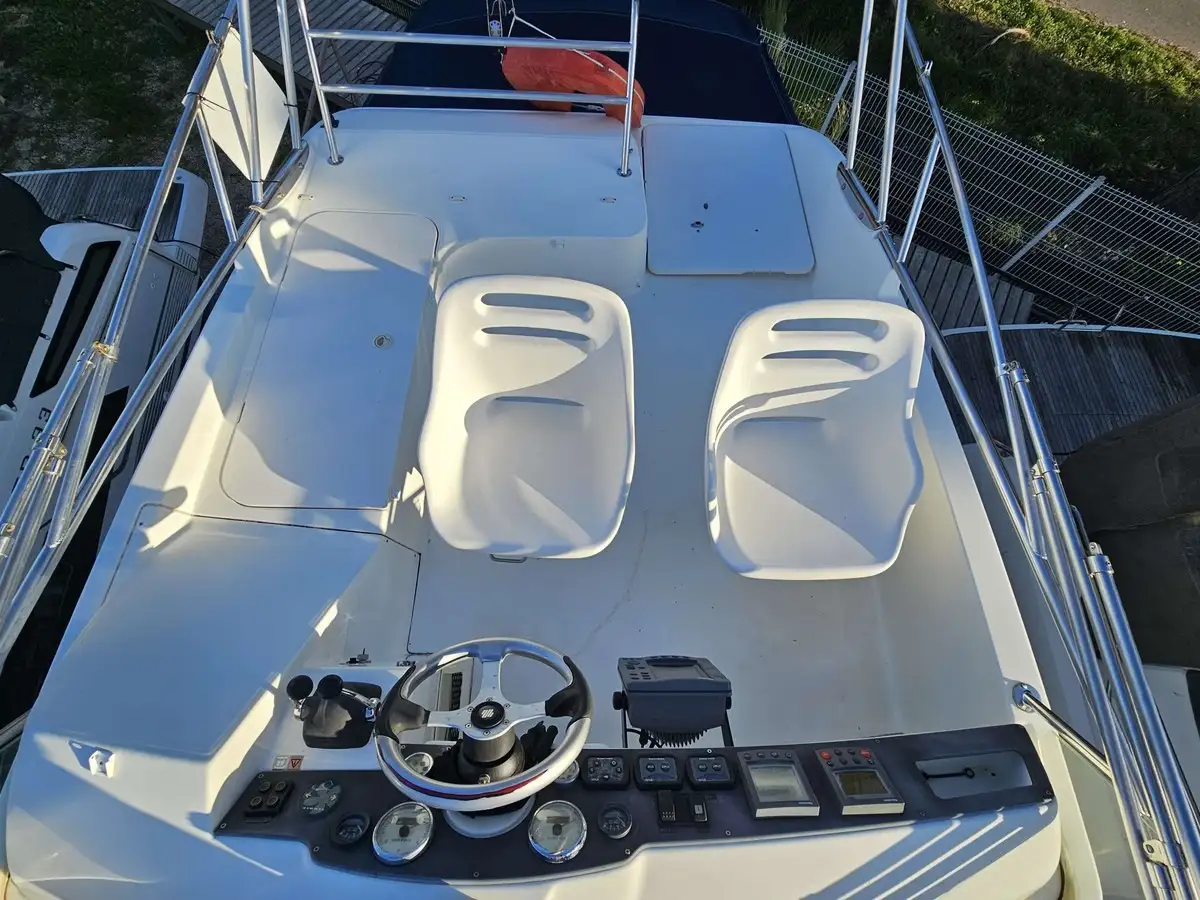 Flybridge Convivial : Un véritable poste de pilotage extérieur avec banquette et bain de soleil, offrant une visibilité parfaite pour les manœuvres et les traversées ensoleillées.
