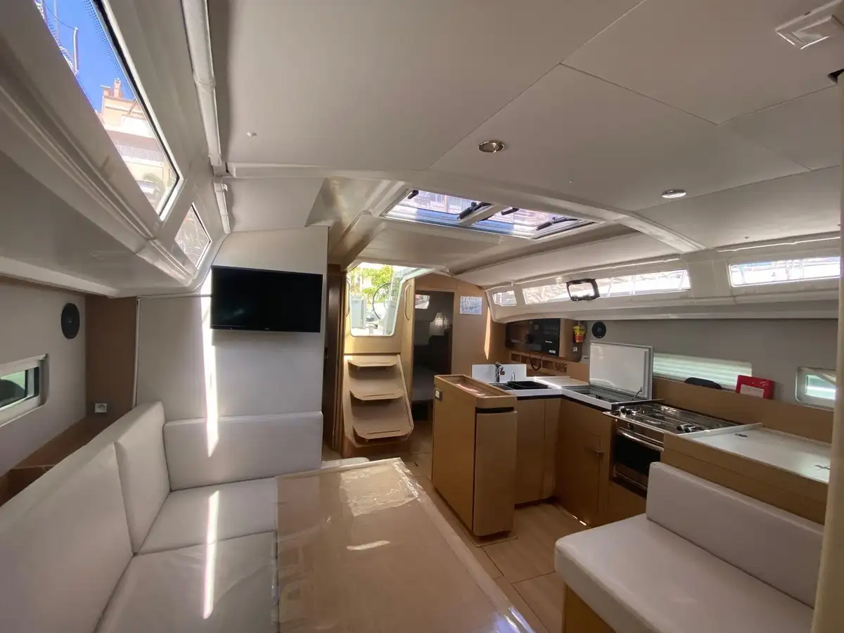 Son intérieur propose 3 cabines spacieuses, dont une master, et une salle d’eau avec WC électriques. La cuisine centrale est fonctionnelle et équipée (eau douce et eau de mer, pompe de vidange pour le frigo), le carré chaleureux avec table télescopique, télévision et cave à vin apportant une touche de confort supplémentaire.Le cockpit ergonomique, avec plancher en teck, plage de bain escamotable motorisée, large bimini, douchette et grande table de cockpit, garantit une qualité de vie à bord exceptionnelle, aussi bien en navigation qu’au mouillage.