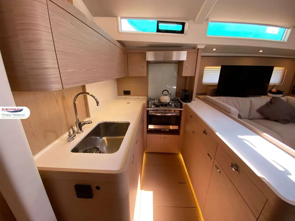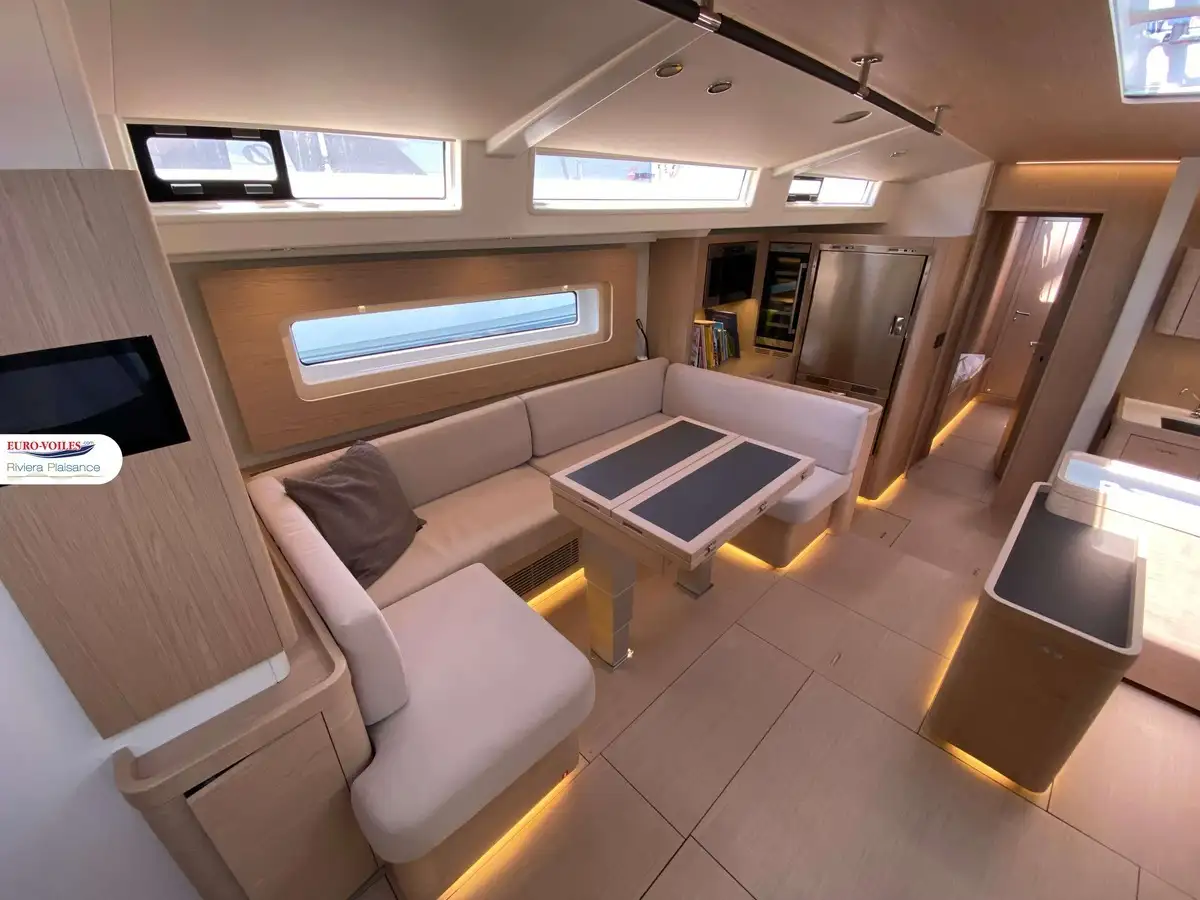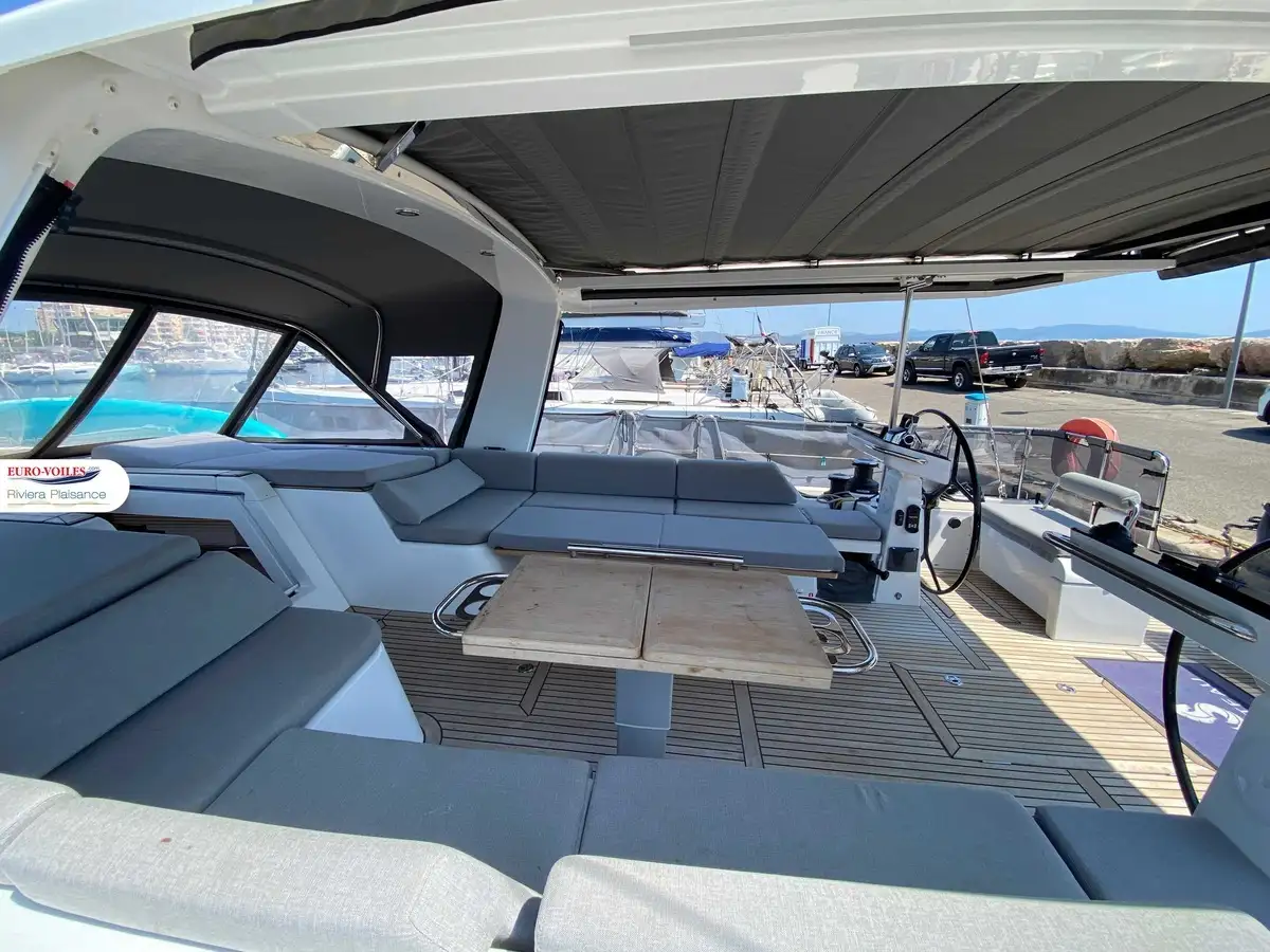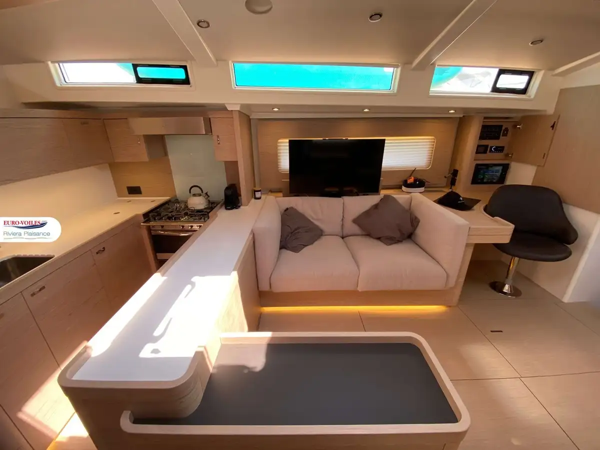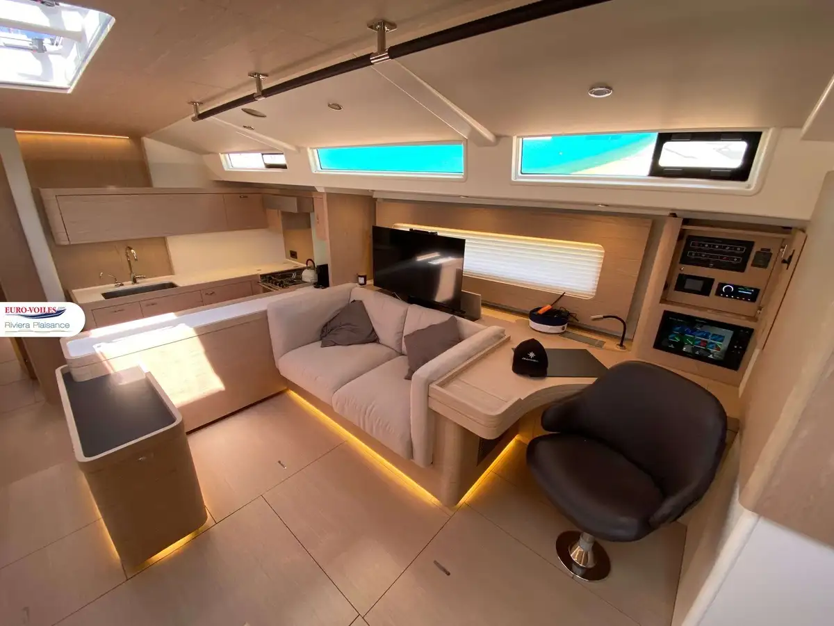 L’intérieur, baigné de lumière naturelle grâce aux nombreuses ouvertures, dévoile une finition haut de gamme et des volumes impressionnants pour un voilier de cette catégorie. Le carré spacieux, la cuisine moderne et ses cabines offrent un véritable confort de vie à bord, avec une suite propriétaire d’un standing remarquable. Le tout est accompagné d’un équipement complet pensé pour l’autonomie et le plaisir à bord : groupe électrogène, dessalinisateur, climatisation, buanderie équipée, électronique haut de gamme, propulseurs d’étrave et de poupe, et bien plus encore. Ce modèle dispose également d’une élégante passerelle hydraulique télécommandée pour un accès à bord pratique et sécurisé.