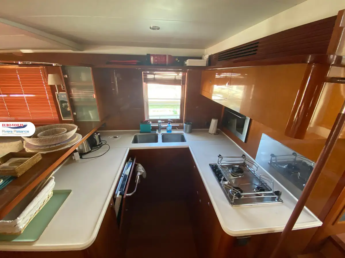 À bord, tout est pensé pour une vie à bord agréable et autonome : volumes généreux, finitions soignées, lumière naturelle omniprésente, sans oublier une cuisine parfaitement équipée pour préparer vos repas comme à la maison. Les trois cabines permettent d’accueillir jusqu’à six personnes dans un confort optimal, avec une suite propriétaire particulièrement spacieuse et bien aménagée. Le bateau bénéficie d’équipements haut de gamme pour les longues croisières : climatisation, groupe électrogène, dessalinisateur, buanderie, électronique complète, propulseurs d’étrave et de poupe.