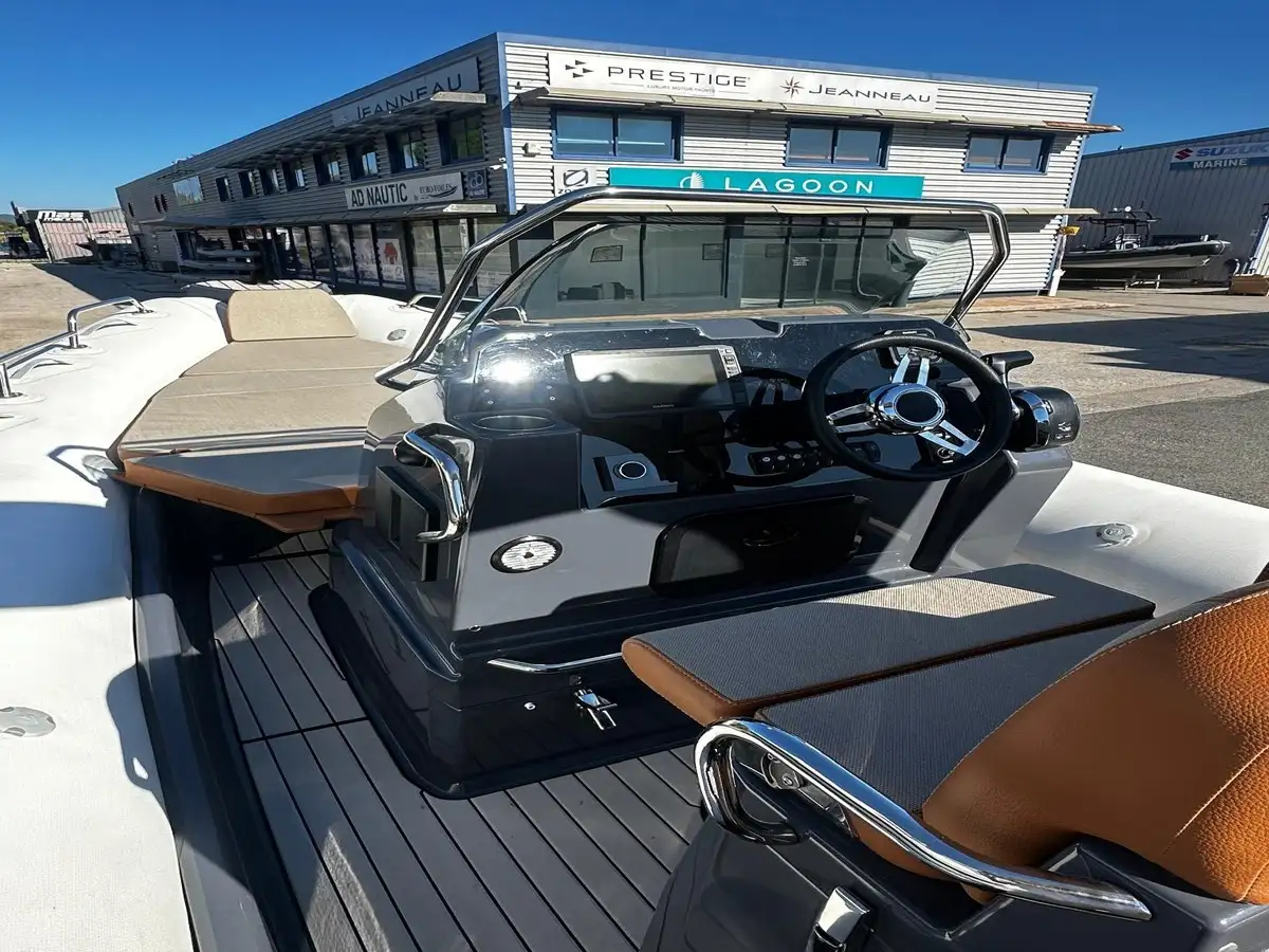 PACK ELEGANCE : Décor console + Pont EVA + Lumieres courtoisie + GPS Garmin 9" + Audio Fusion + Mât de ski + Roll bar + Bimini slide up + Kit coussin transat et dossier confort + BDS arrière + 2 HP pour kit fusion + sonde à coller , Extension bain de soleil avant COULEUR LOUNGE , Bac à glace, Réfrigérateur , Report des infos moteur sur écran Garmin, Sonde tableau arrière avec indication temperature, Guindeau électrique avec interrupteur de commande au poste de pilotage, Balcon avant, Main courante console Medline 7.5..