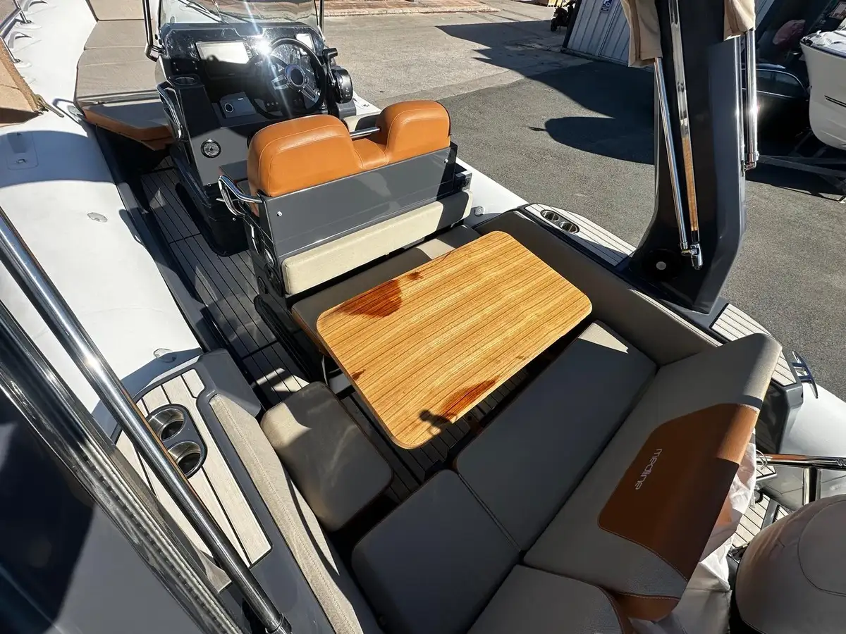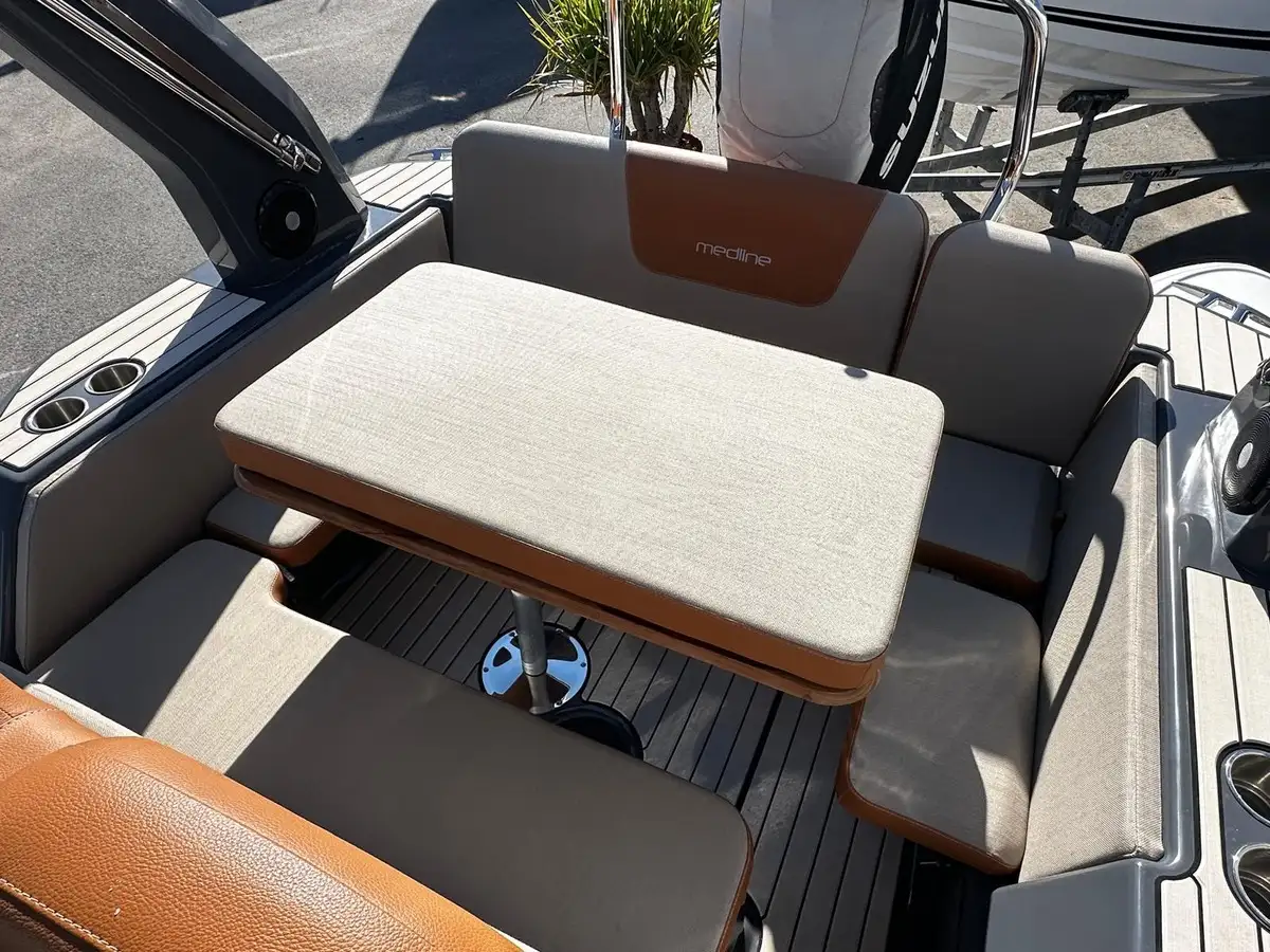 PACK ELEGANCE : Décor console + Pont EVA + Lumieres courtoisie + GPS Garmin 9" + Audio Fusion + Mât de ski + Roll bar + Bimini slide up + Kit coussin transat et dossier confort + BDS arrière + 2 HP pour kit fusion + sonde à coller , Extension bain de soleil avant COULEUR LOUNGE , Bac à glace, Réfrigérateur , Report des infos moteur sur écran Garmin, Sonde tableau arrière avec indication temperature, Guindeau électrique avec interrupteur de commande au poste de pilotage, Balcon avant, Main courante console Medline 7.5..