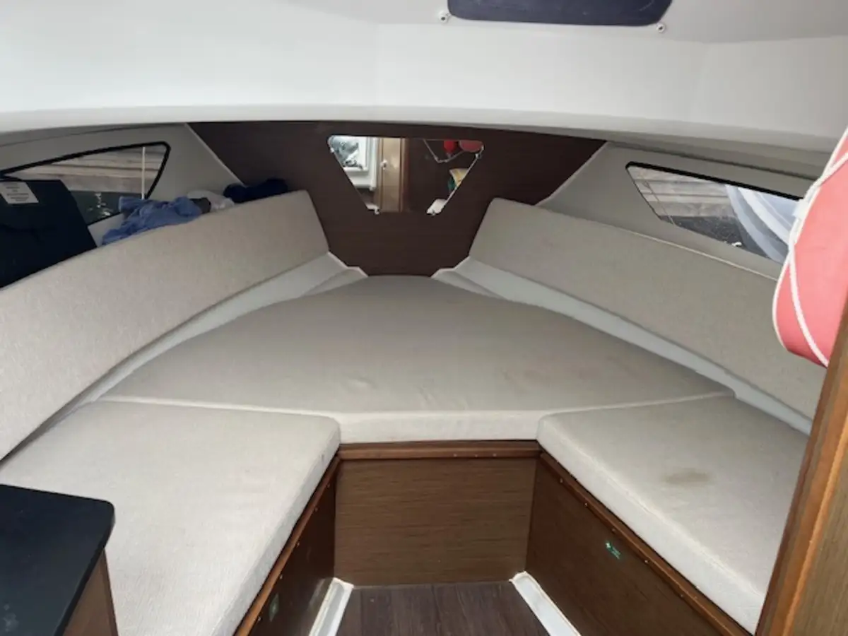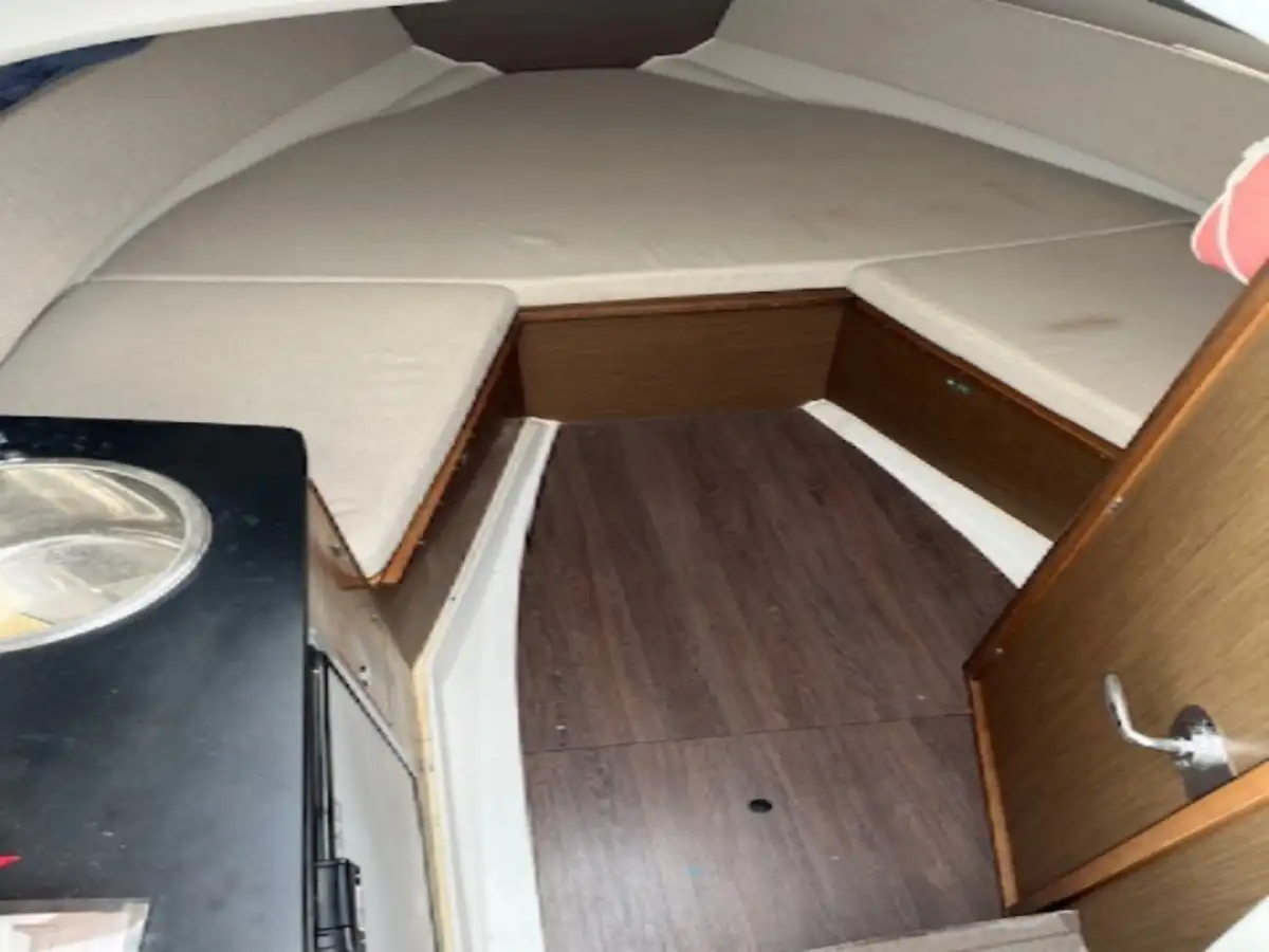 L'intérieur est lumineux et comprend un salon transformable en couchage, un aménagement sur mesure pour la table de cabine, un réfrigérateur, un évier et un WC marin avec réservoir à eaux noires.
