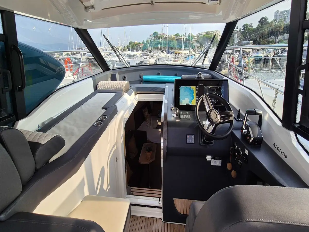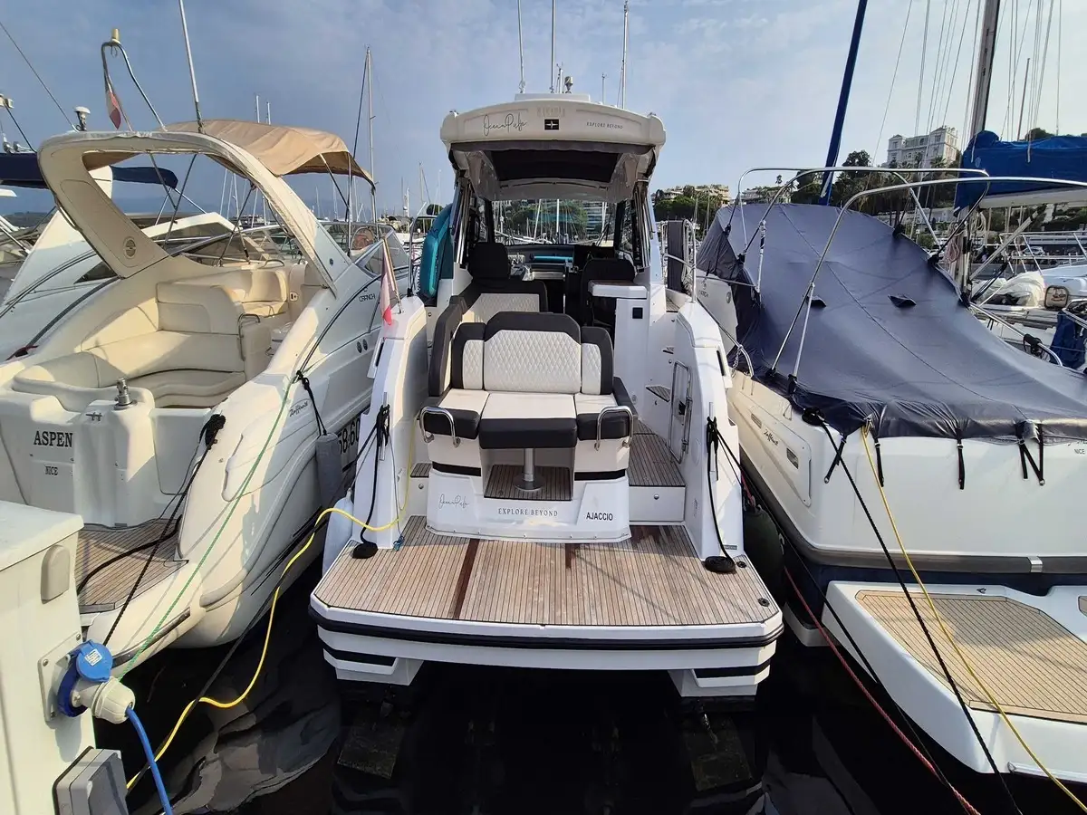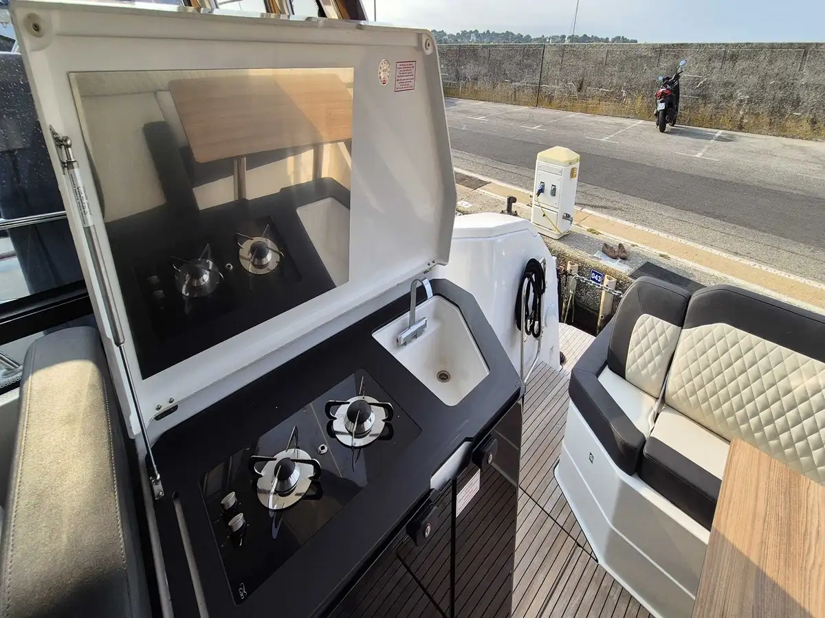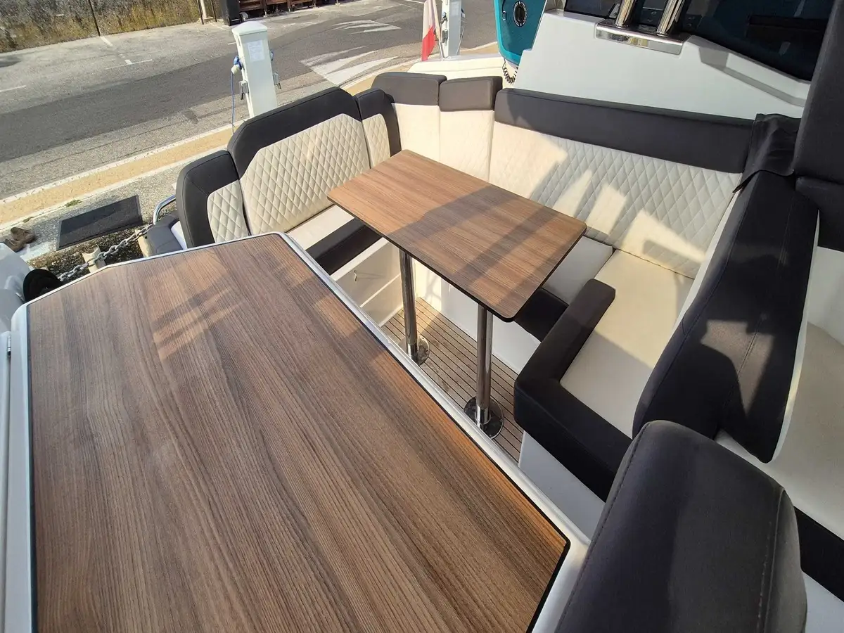 Ce modèle récent 2024 offre le parfait équilibre entre design moderne et convivialité. Son hard-top panoramique, son vaste cockpit et son grand bain de soleil transformable en table invitent à partager des moments uniques en mer comme au port.