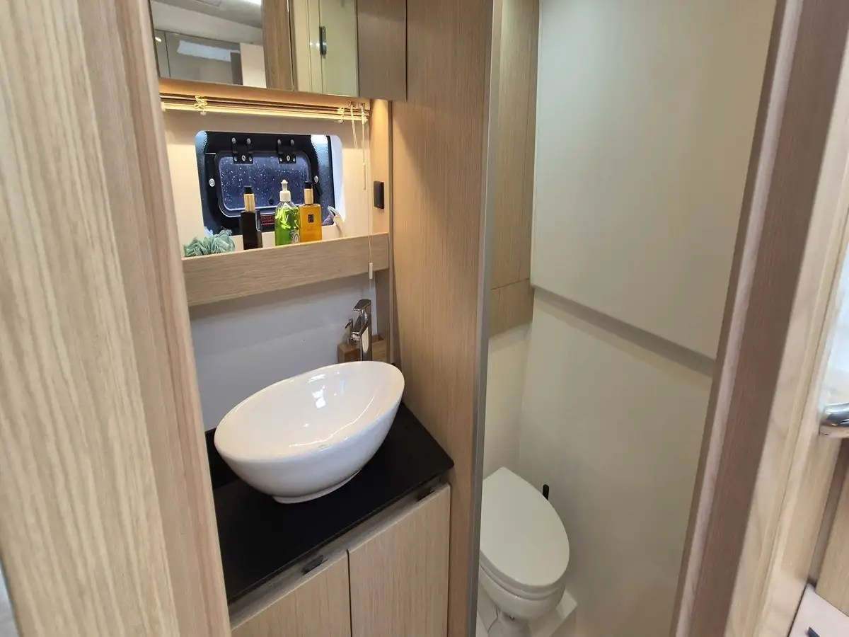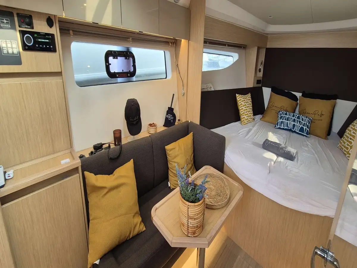 À bord : un espace lumineux et fonctionnel, cuisine extérieure équipée, GPS 12’’, propulseur d’étrave, passavants en teck, boiserie claire, cabine séparée pour plus d’intimité et une magnifique pointe avant transformée en grand couchage façon loft. Salle d’eau avec WC électrique.