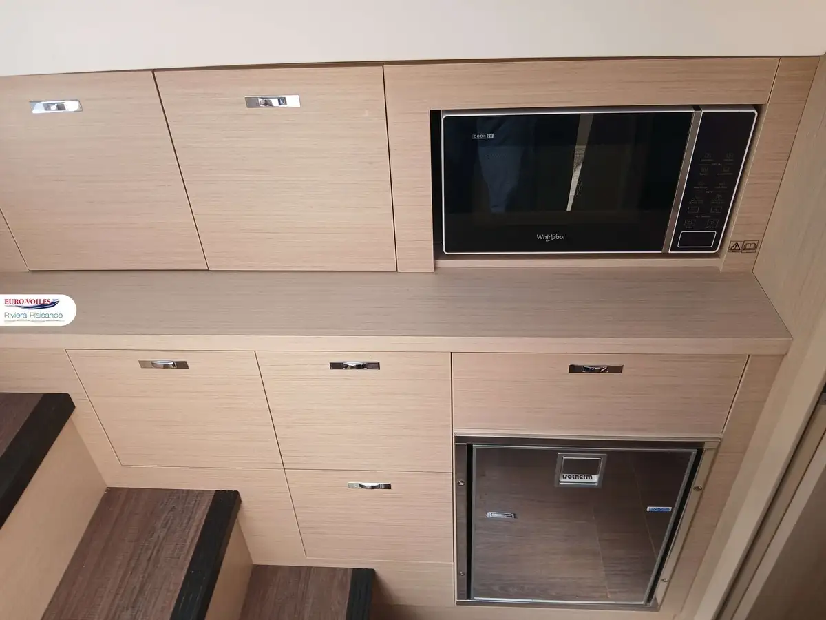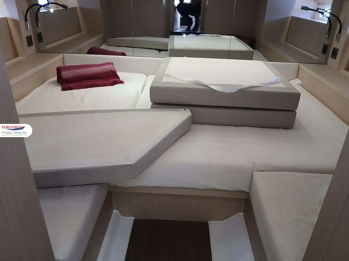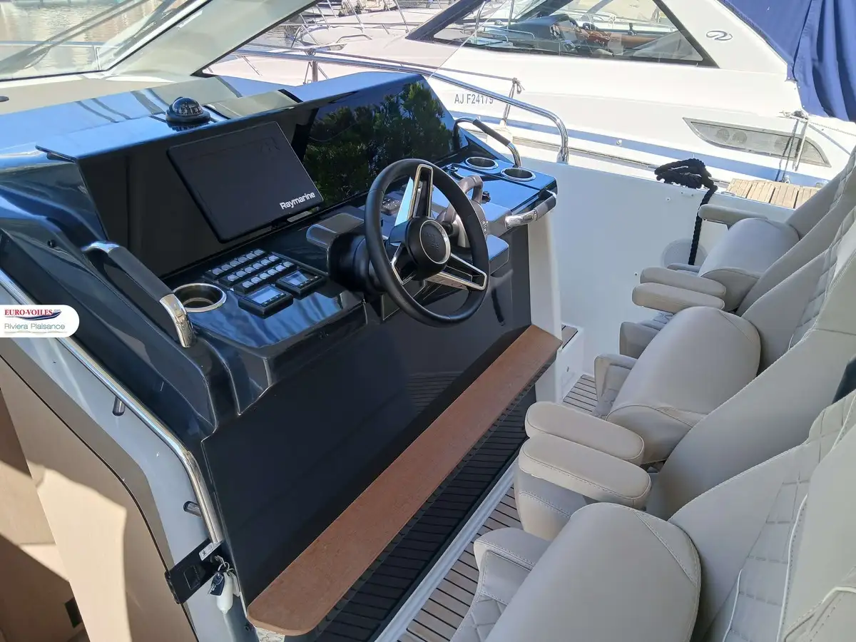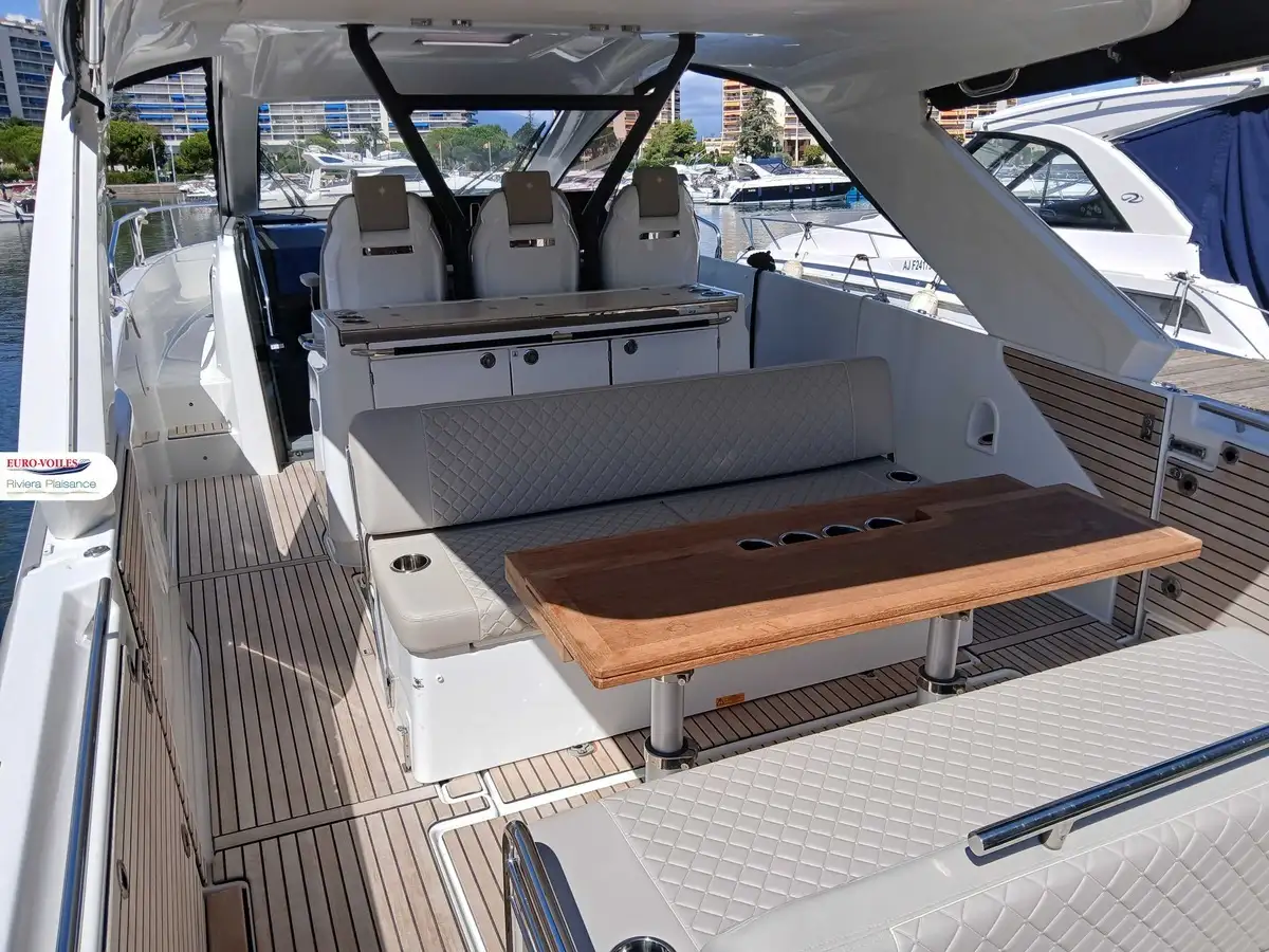 L’intérieur lumineux et raffiné offre une superbe cabine propriétaire, une cabine invités, une salle d’eau moderne et un breakfast point parfaitement équipé. Les finitions en teck, la sellerie Macadamia White, les toiles de fermeture et les packs premium témoignent du soin apporté à chaque détail, pour un confort et une convivialité sans compromis.