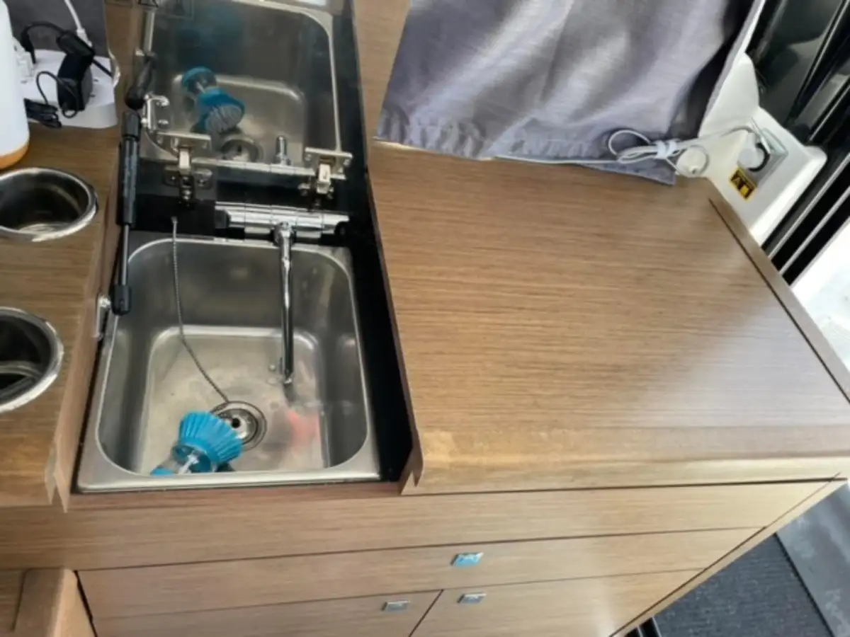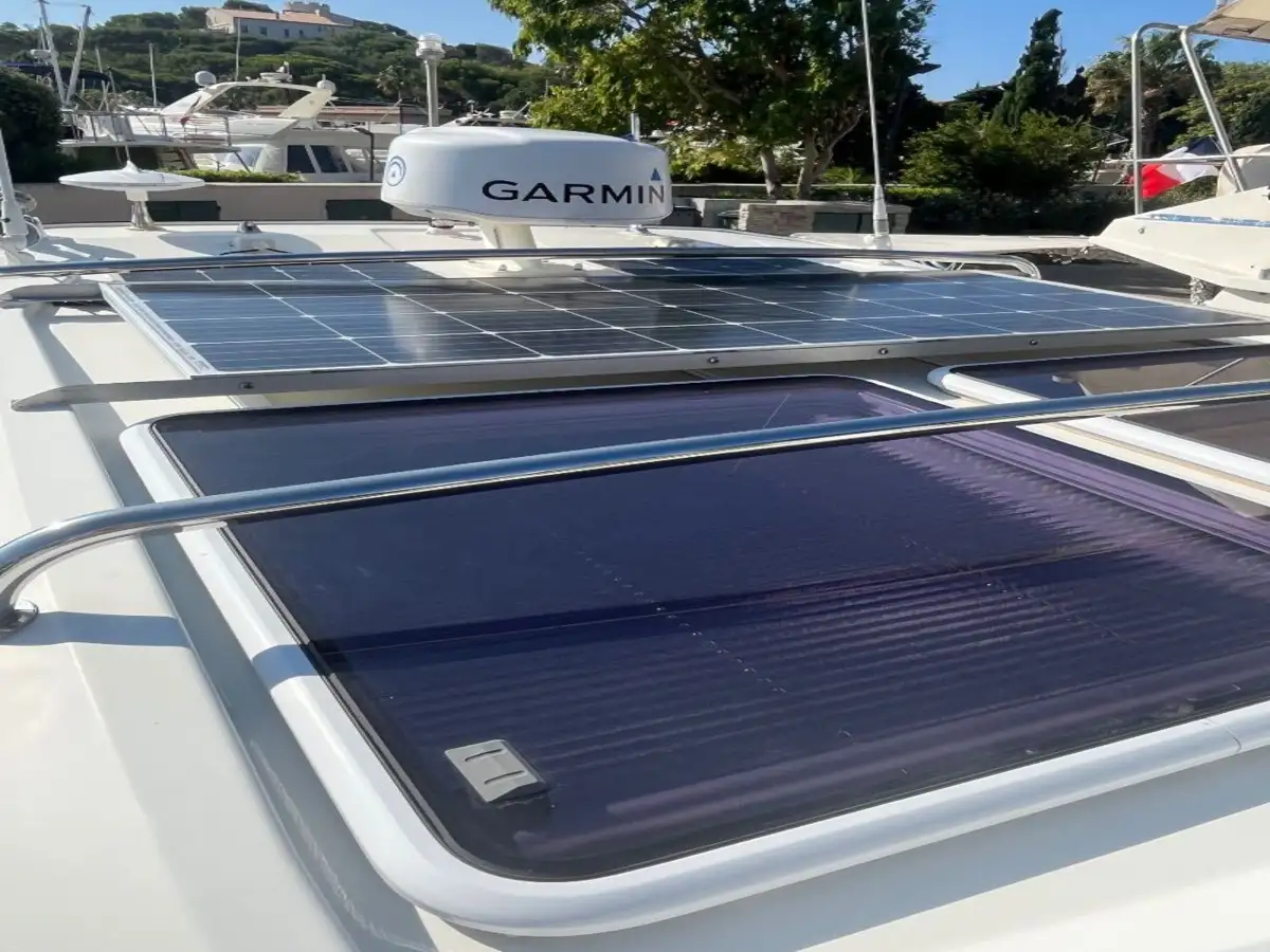 Les aménagements intérieurs et extérieurs sont élégants et fonctionnels : pont latté en teck, meuble de rangement sur mesure dans la cuisine, TV dans le cockpit 12v et TV sur 220 dans la cabine avant, panneaux solaires (2x50W et 200W avec régulateur Victron) et deux batteries 140Ah de 2024 pour une autonomie maximale.