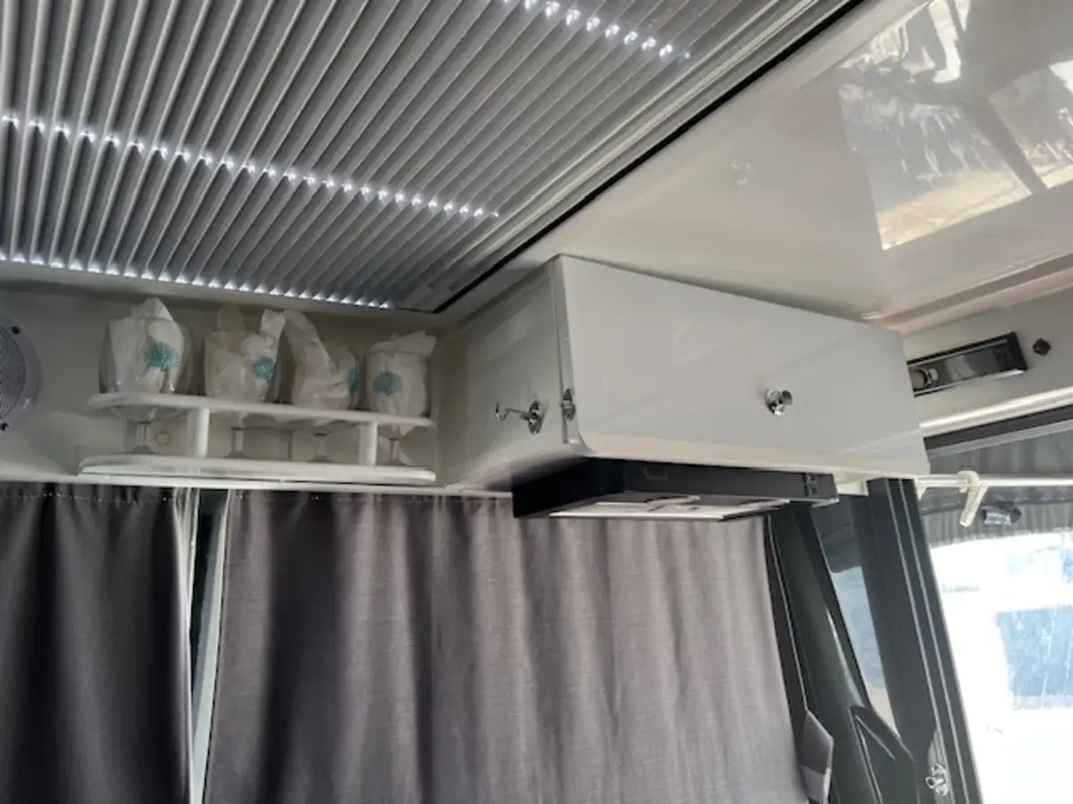 Le pack confort comprend : climatisation à quai 220V, propulseur d’étrave et de poupe avec commande d’accostage groupée (rare), capteurs de température et niveau d’eau douce, flaps électriques automatiques ZIPWAKE, taud de fermeture complet + taud micro-perforé sur mesure, support inox porte-annexe avec chaise pour moteur hors-bord, et galerie de toit pour paddle.