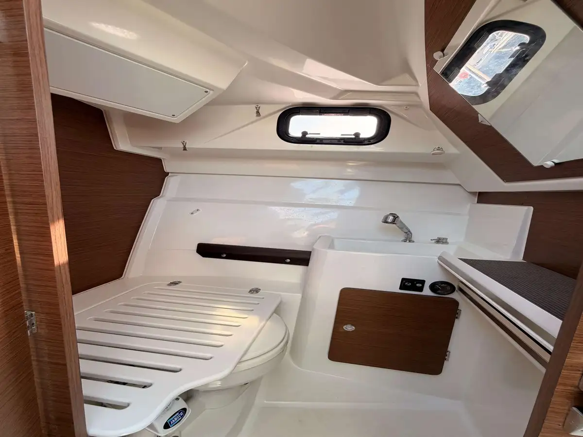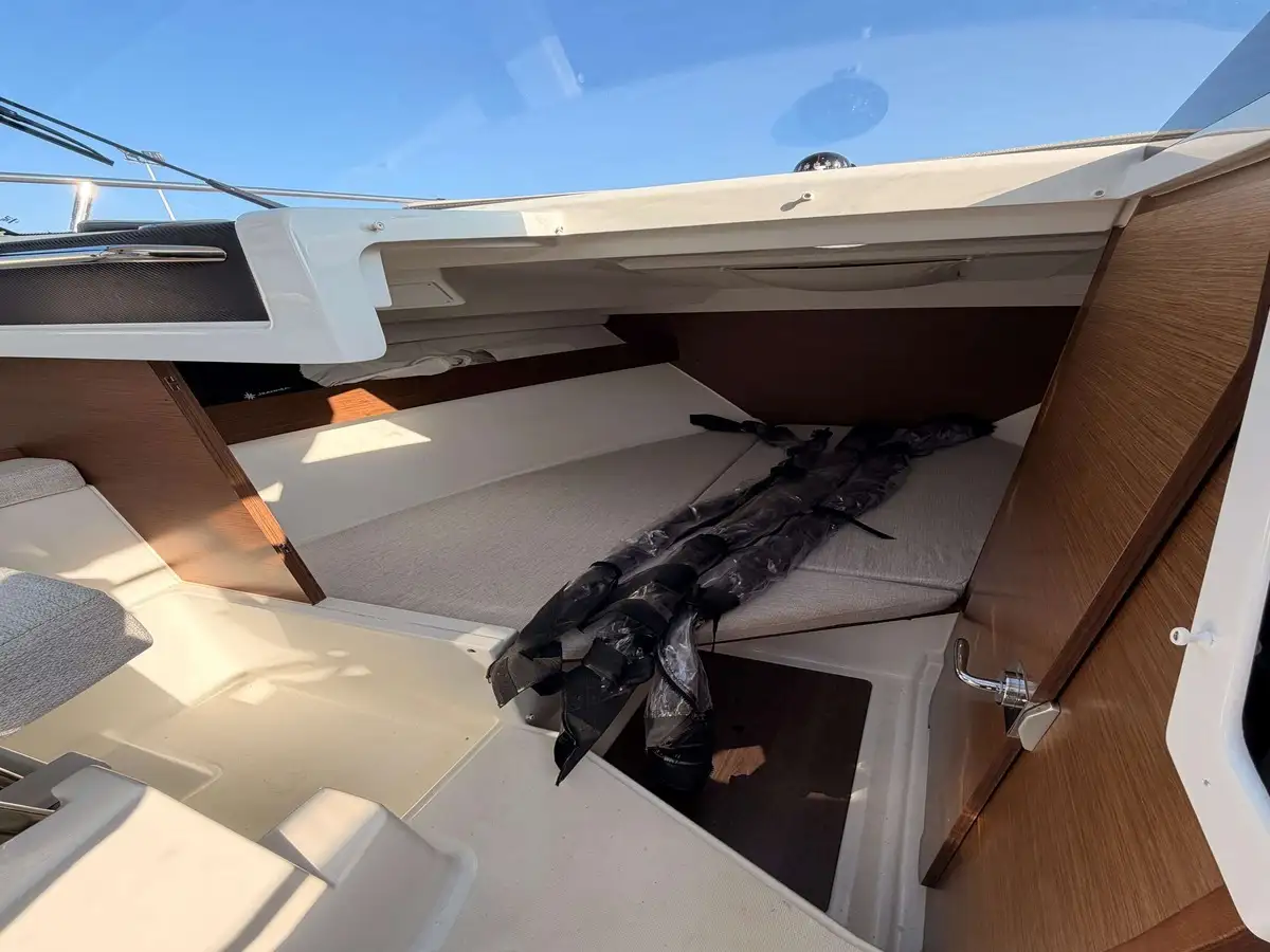 Très bien équipée : panneau solaire, convertisseur, galerie pour paddle sur le toit, casquette de soleil avec fermeture complète type camping, propulseur d’étrave, prise de quai 220V avec chargeur, guindeau électrique, GPS sondeur GARMIN avec cartographie, douche avec chauffe eau, WC marin avec réservoir eaux noires, cuisine luxe avec réchaud gaz et réfrigérateur 40L , complément de couchage dans le carré, prises 12V et 220V, table extérieure, plateformes de bain et circulation sécurisée.