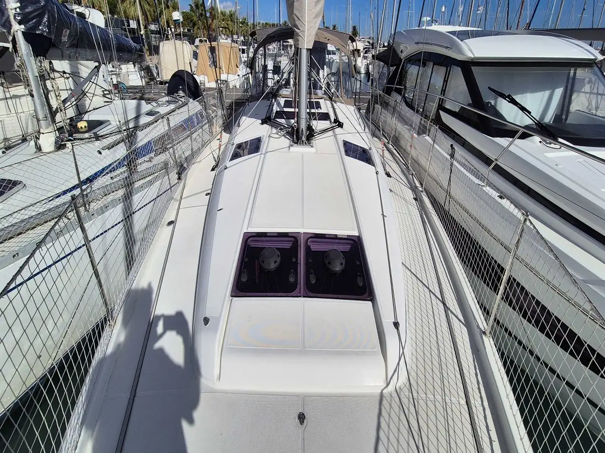 Ce 440 dispose d’un équipement haut de gamme complet, idéal pour la grande croisière. On retrouve les packs Excellence, Downwind et Voyageur, ainsi qu’un pack électronique Offshore avec un lecteur de carte à chaque poste de barre. Le propulseur d’étrave rétractable, les trois winches électriques, la grande voile full batten, le gennaker sur emmagasineur, les panneaux solaires, l’annexe, l’armement de sécurité complet et la climatisation dans le carré assurent un confort et une autonomie exceptionnels à bord.