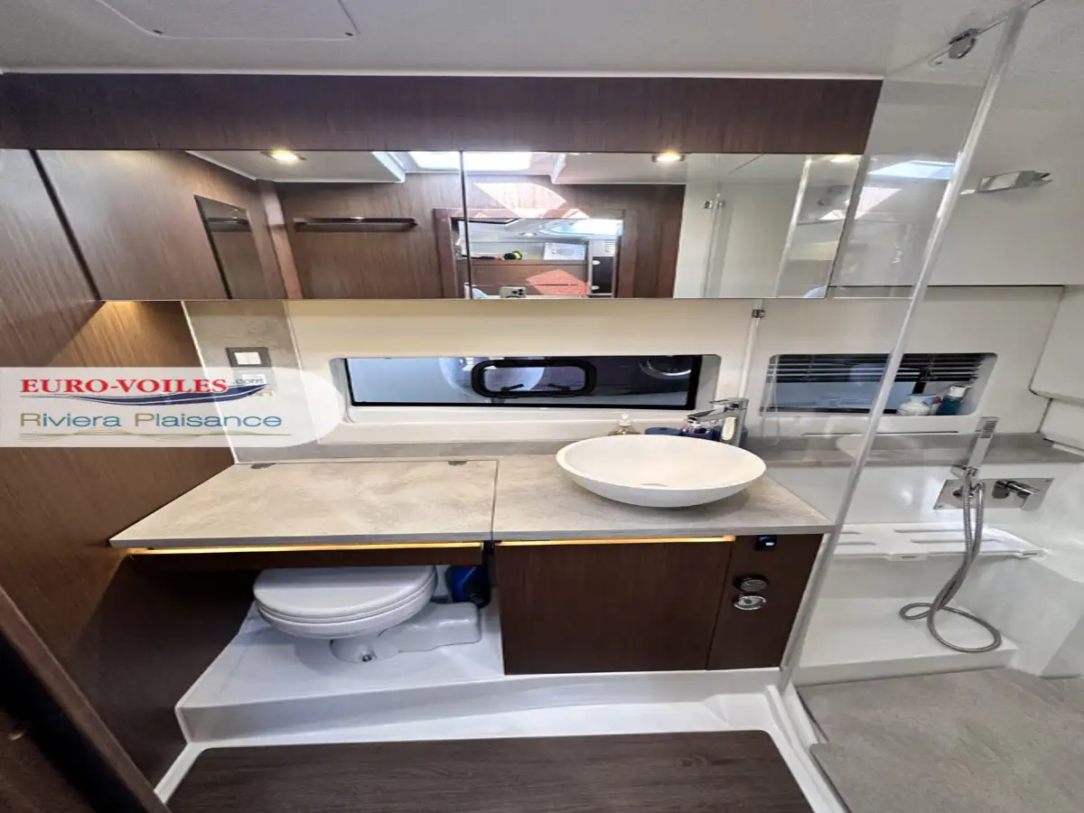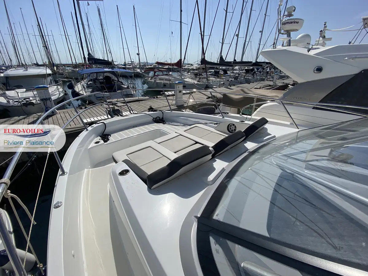 Parmi ses équipements notables : une terrasse latérale électrique à bâbord, un bain de soleil avant 3 places façon chaises longues, une table de cockpit en bois transformable en bain de soleil arrière, un cockpit, une plateforme de bain et une terrasse en teck, une casquette de toit coulissante électrique SURSHADE, ainsi que deux écrans Garmin 12 pouces et une VHF.