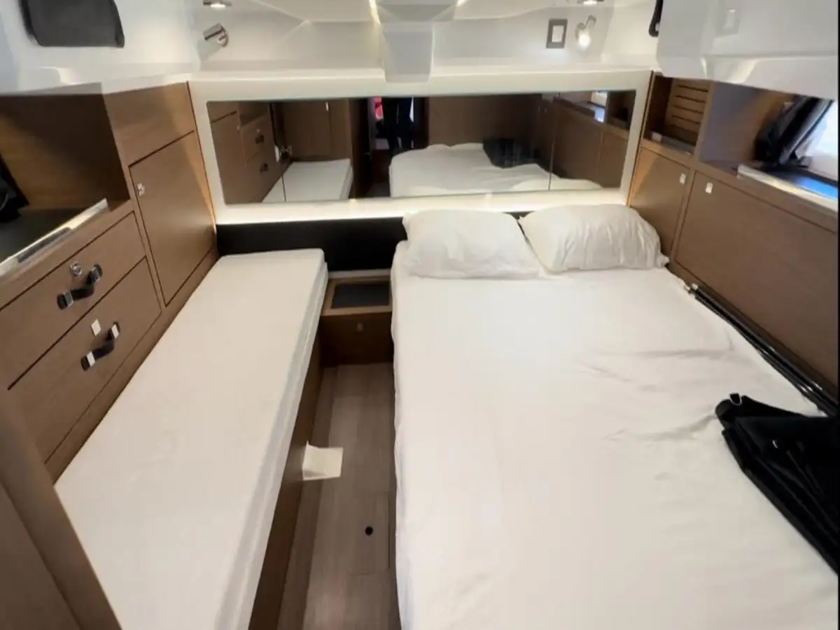 L’intérieur n’est pas en reste, avec une véritable cabine propriétaire avec lit king-size, sofa, vue mer, une belle salle d’eau et une cabine invités indépendante. La cuisine intérieure équipée offre tout le nécessaire pour profiter de croisières confortables.