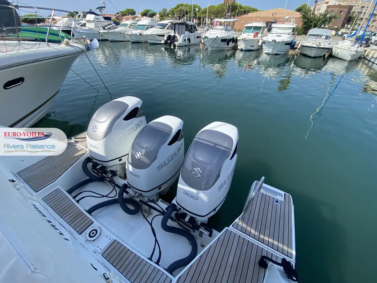 Motorisé en triple Suzuki 3 x 300 cv blancs avec hélices duo prop, ce 12.5 WA totalise seulement 48 heures de navigation. Une opportunité rare pour un bateau aussi bien équipé, n’ayant connu qu’un seul propriétaire.