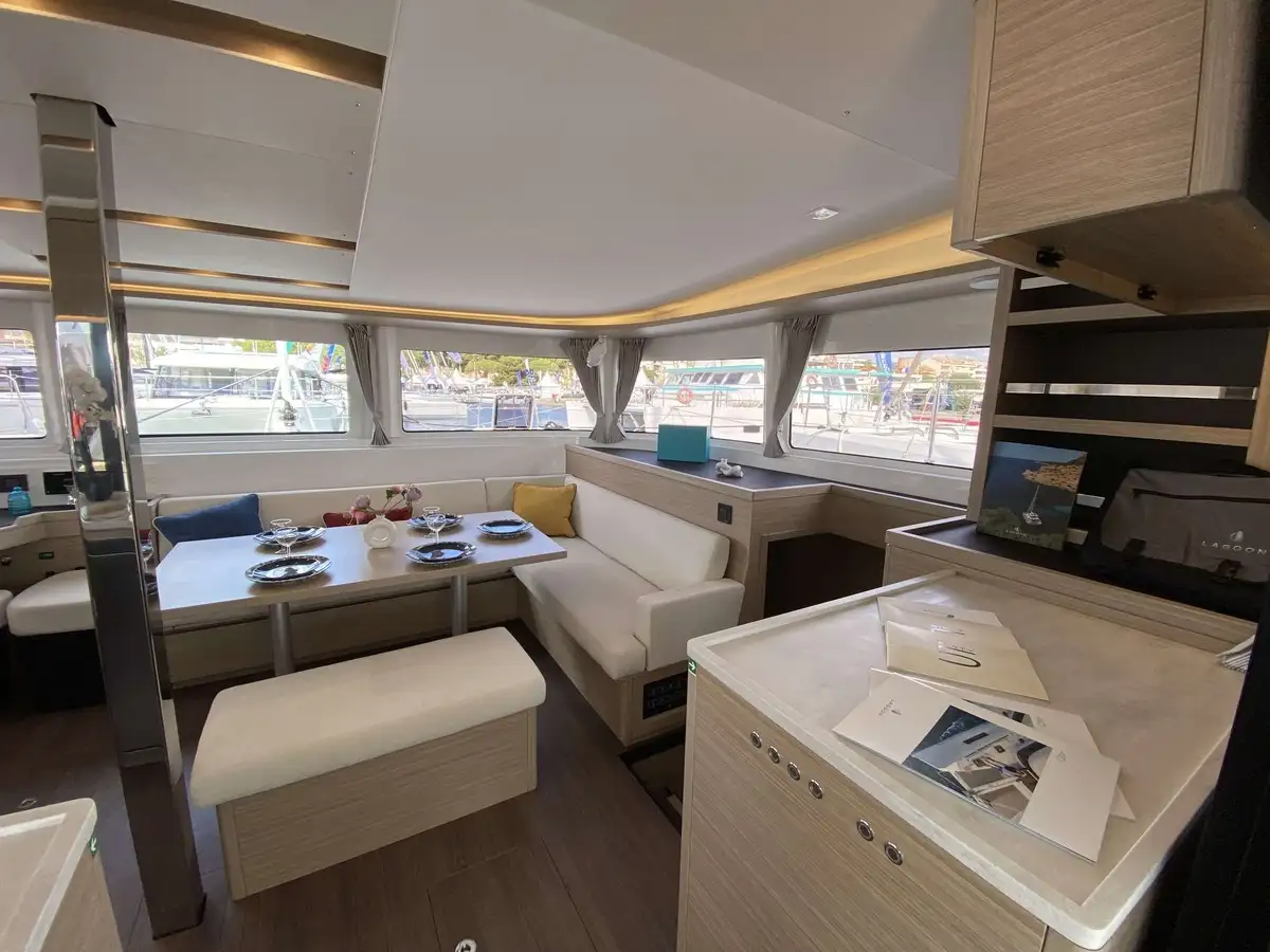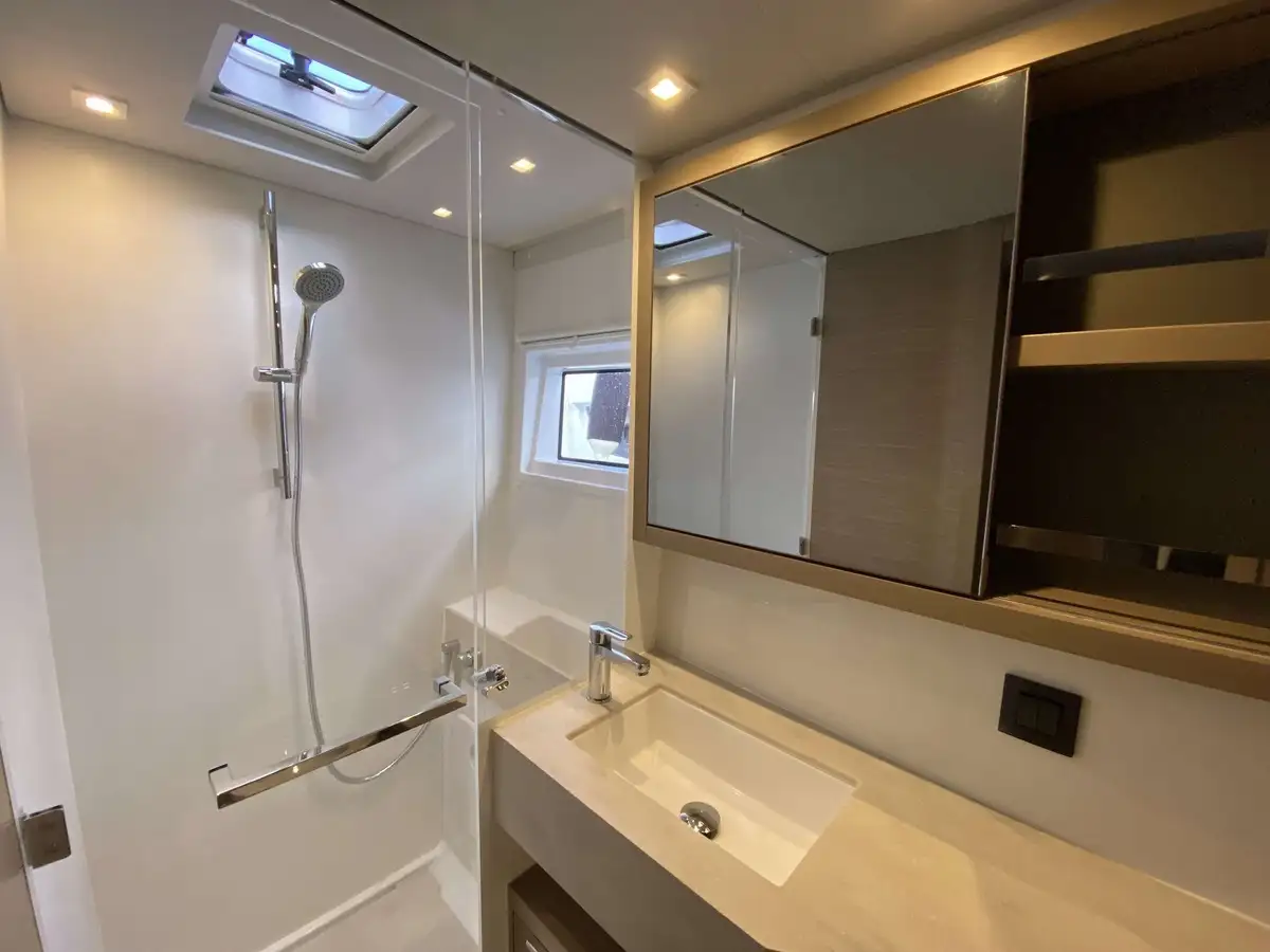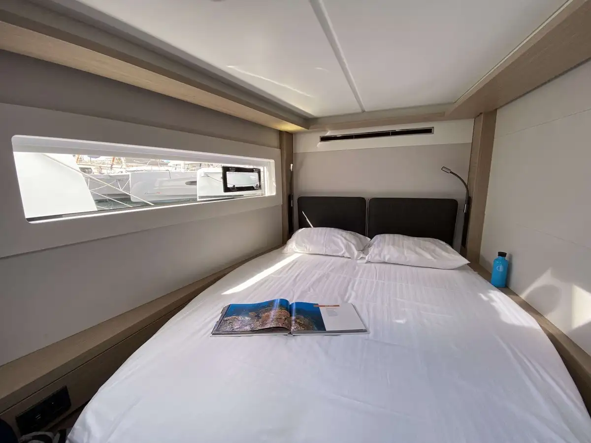 Ce Lagoon 46 dispose de 4 cabines, finitions luxe millésime 2025, avec 4 salles de bain privées. Il est équipé pour un confort optimal au mouillage avec dessalinisateur, générateur, climatisation, annexe Highfield avec moteur 20 CV et, nouveauté 2024, une bôme enrouleur Lagoon Safe et révolutionnaire.