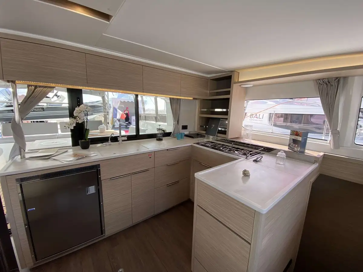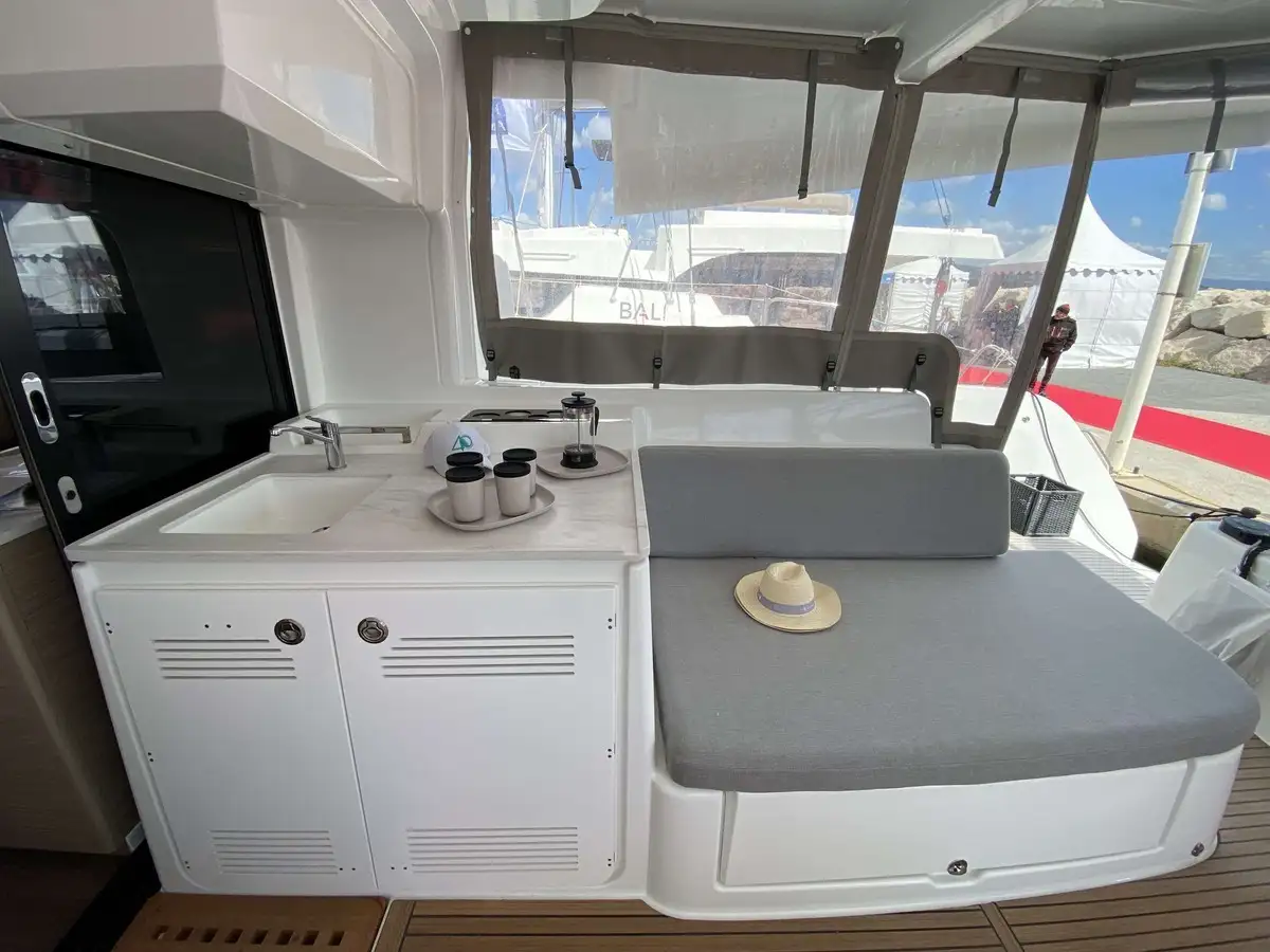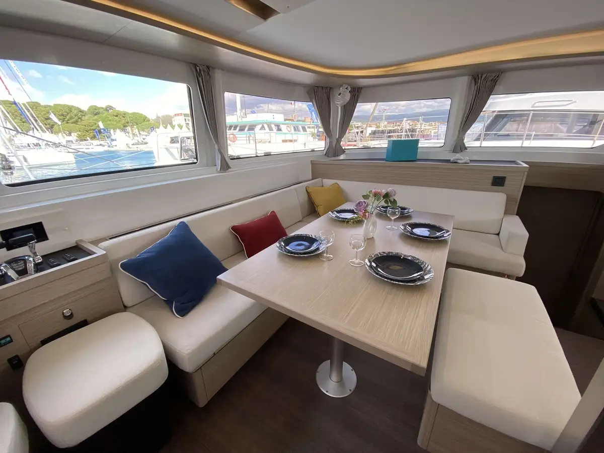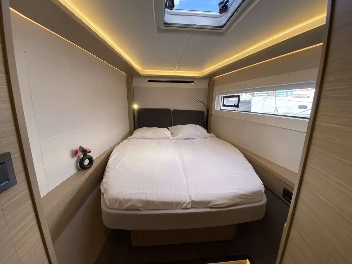Ce Lagoon 46 dispose de 4 cabines, finitions luxe millésime 2025, avec 4 salles de bain privées. Il est équipé pour un confort optimal au mouillage avec dessalinisateur, générateur, climatisation, annexe Highfield avec moteur 20 CV et, nouveauté 2024, une bôme enrouleur Lagoon Safe et révolutionnaire.