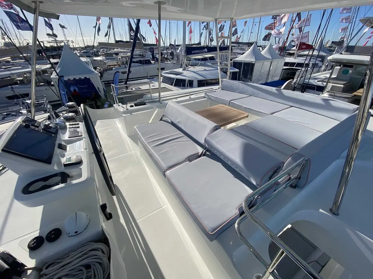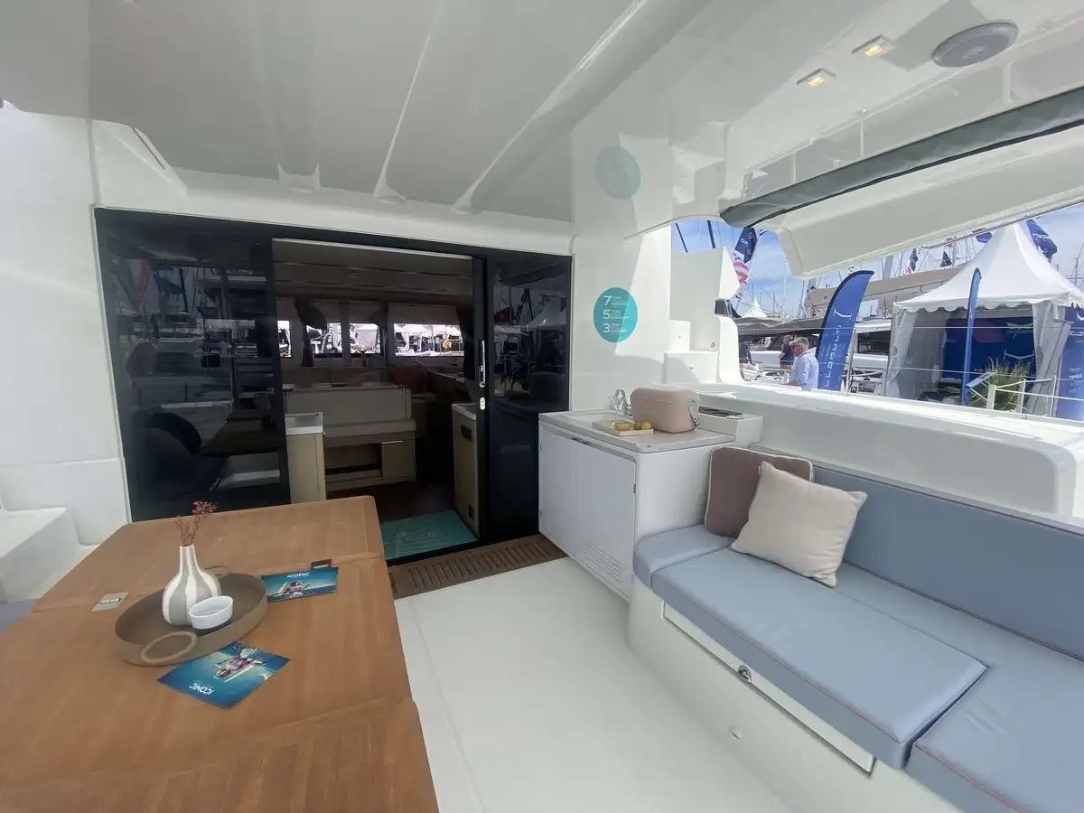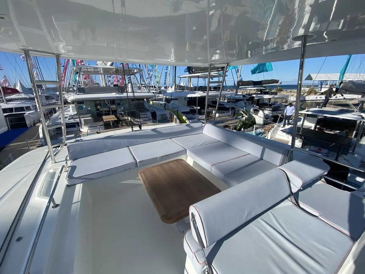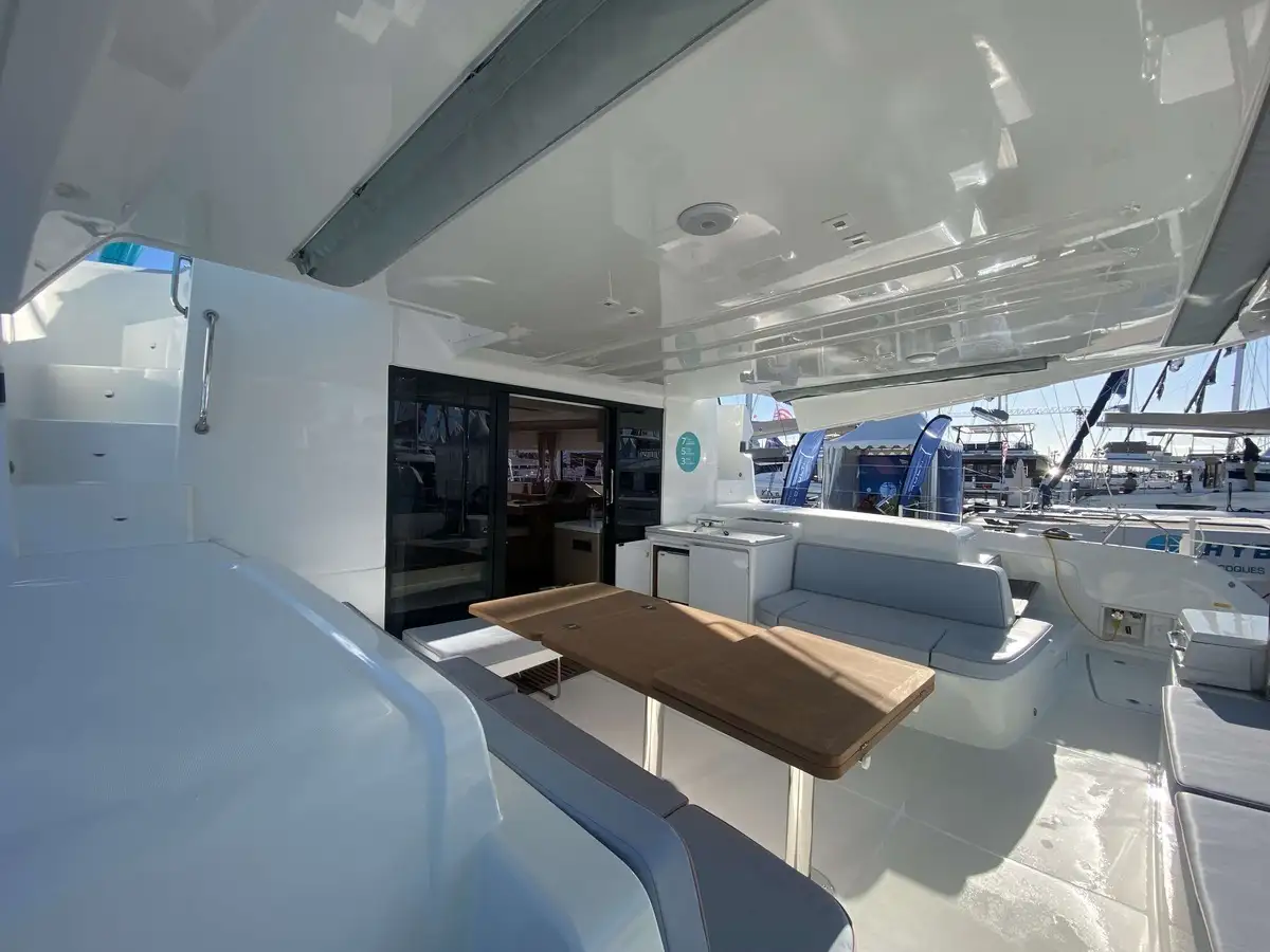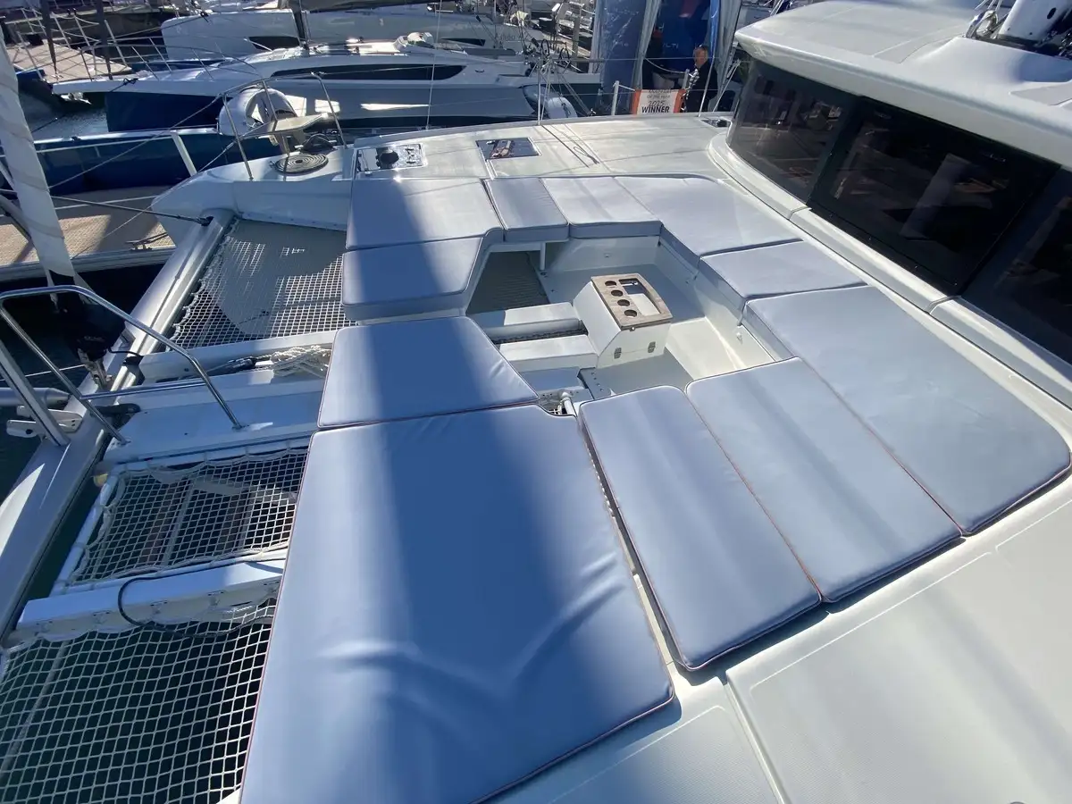 À l’avant, le catamaran dévoile une nouvelle zone lounge, véritable invitation à la détente : davantage de bains de soleil, un espace plus convivial et un accès direct à la mer grâce à une échelle intégrée, pensée pour des mouillages en toute sérénité.