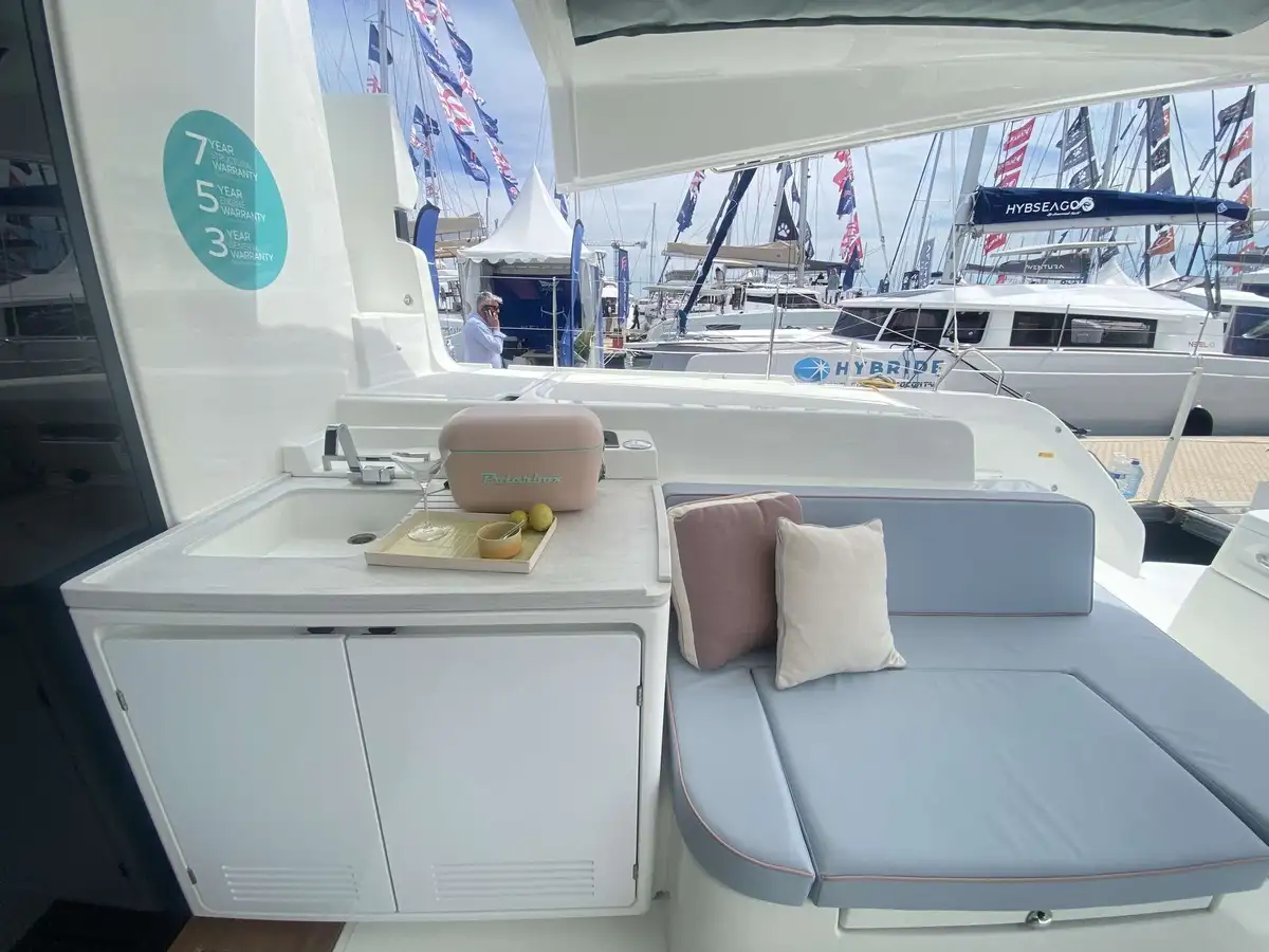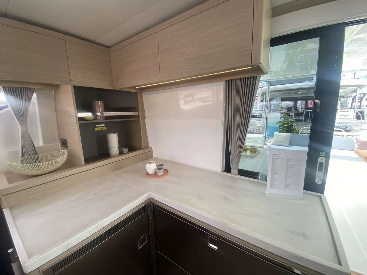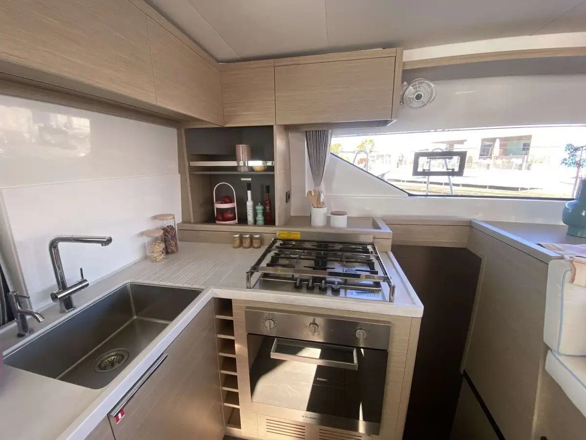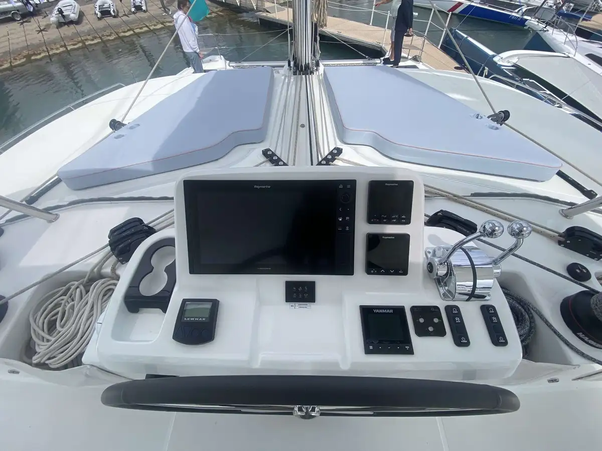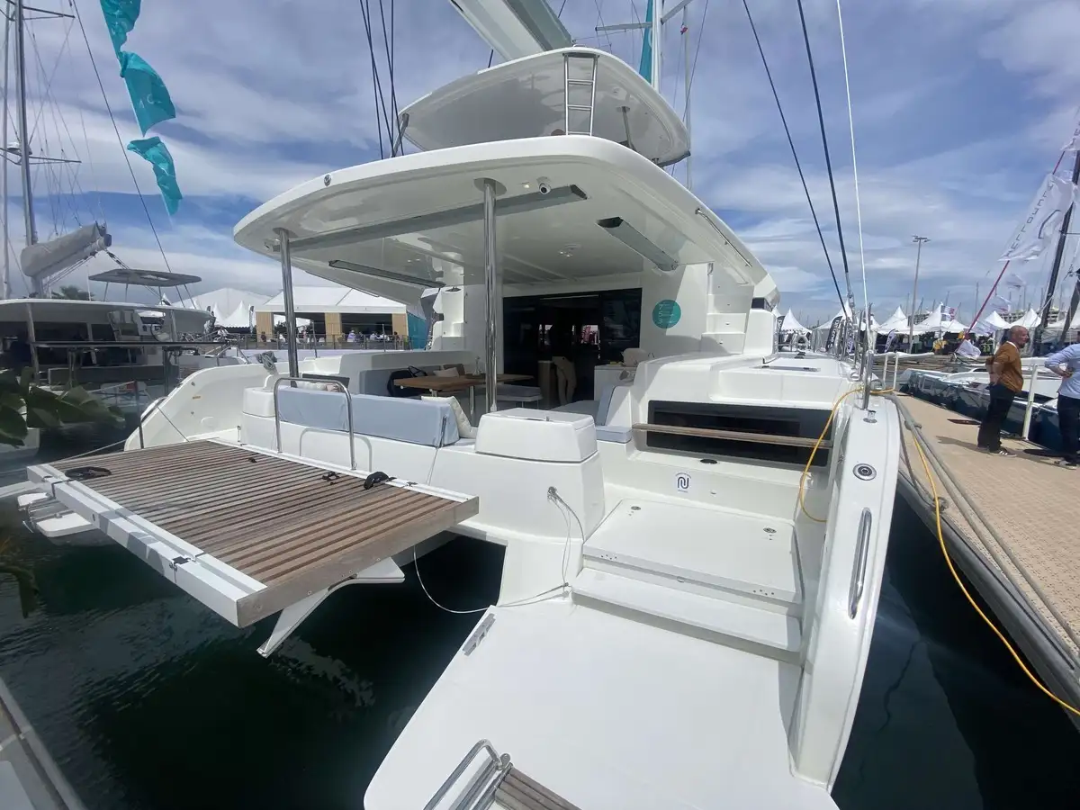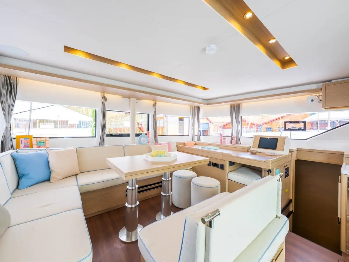 À l’avant, le catamaran dévoile une nouvelle zone lounge, véritable invitation à la détente : davantage de bains de soleil, un espace plus convivial et un accès direct à la mer grâce à une échelle intégrée, pensée pour des mouillages en toute sérénité.