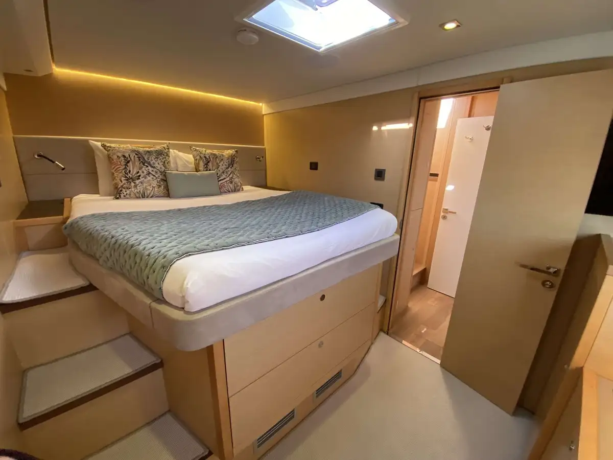 Le pont en iroko luit sous le soleil. Les coques arborent fièrement leur bleu profond Stars & Stripes, fraîchement appliqué. Sur le flybridge, le regard porte loin. Très loin. Là où commencent les rêves d’horizons. À l’intérieur, l’atmosphère invite à la détente. Boiseries en chêne blond, textiles haut de gamme, mobilier sur-mesure, chaque détail respire la qualité. On s’y sent bien, comme dans un loft flottant.