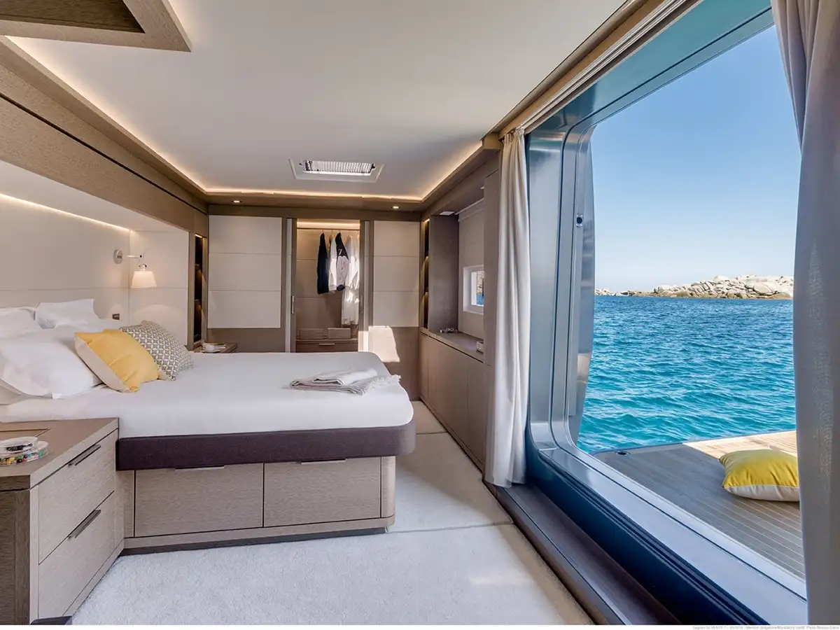 Différentes versions d’aménagement proposées avec 3, 4 voire 5 cabines invités équipées chacune d’un lit island bed, d’un bureau, de nombreux rangements et complétées par une salle de bain privative.