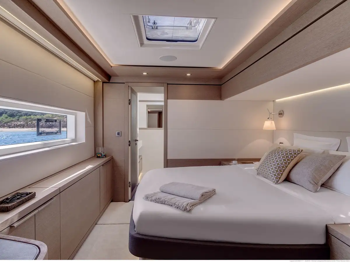 - Un très grand choix d’aménagements pour différents scenarios de vie à bord : jusqu’à cinq cabines équipées chacune d’un lit « Island bed », de nombreux rangements et complétées par une salle de bain privative.