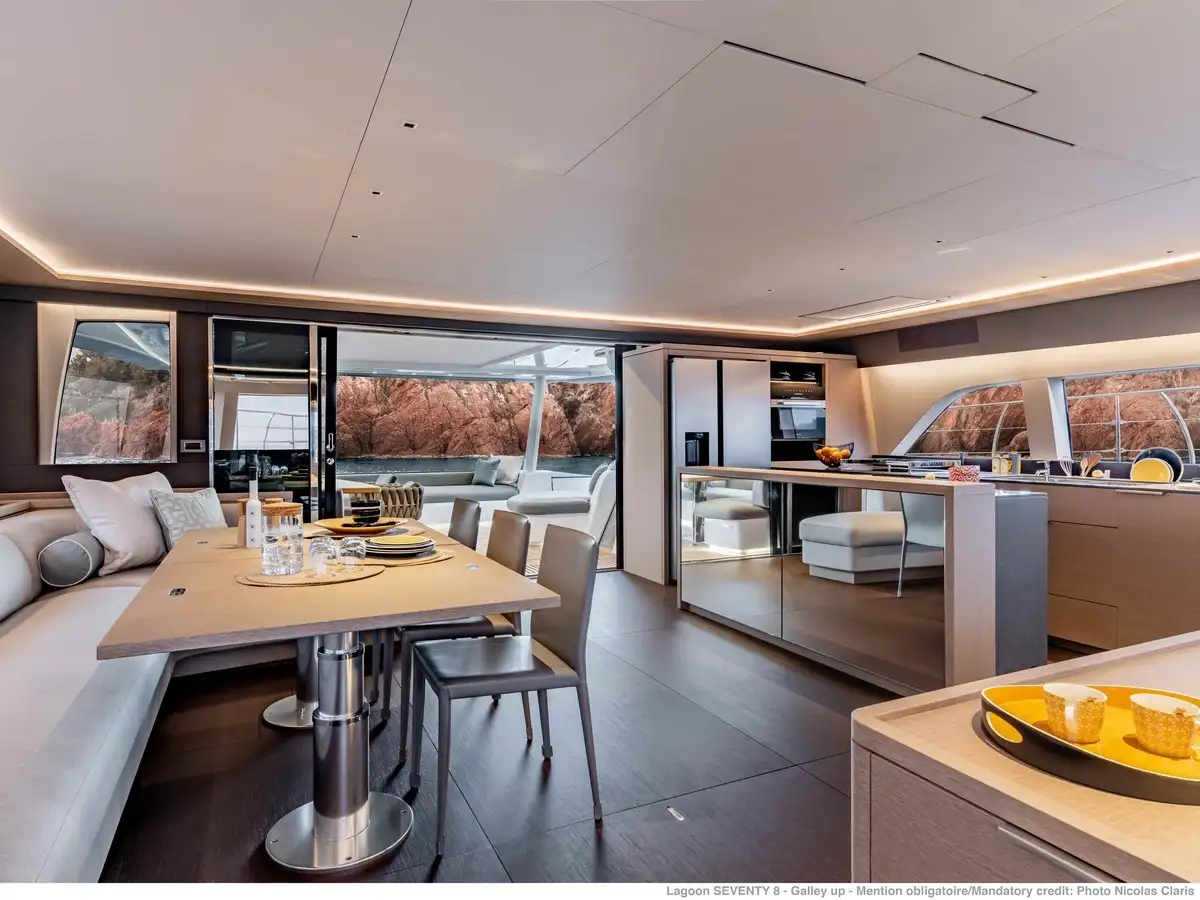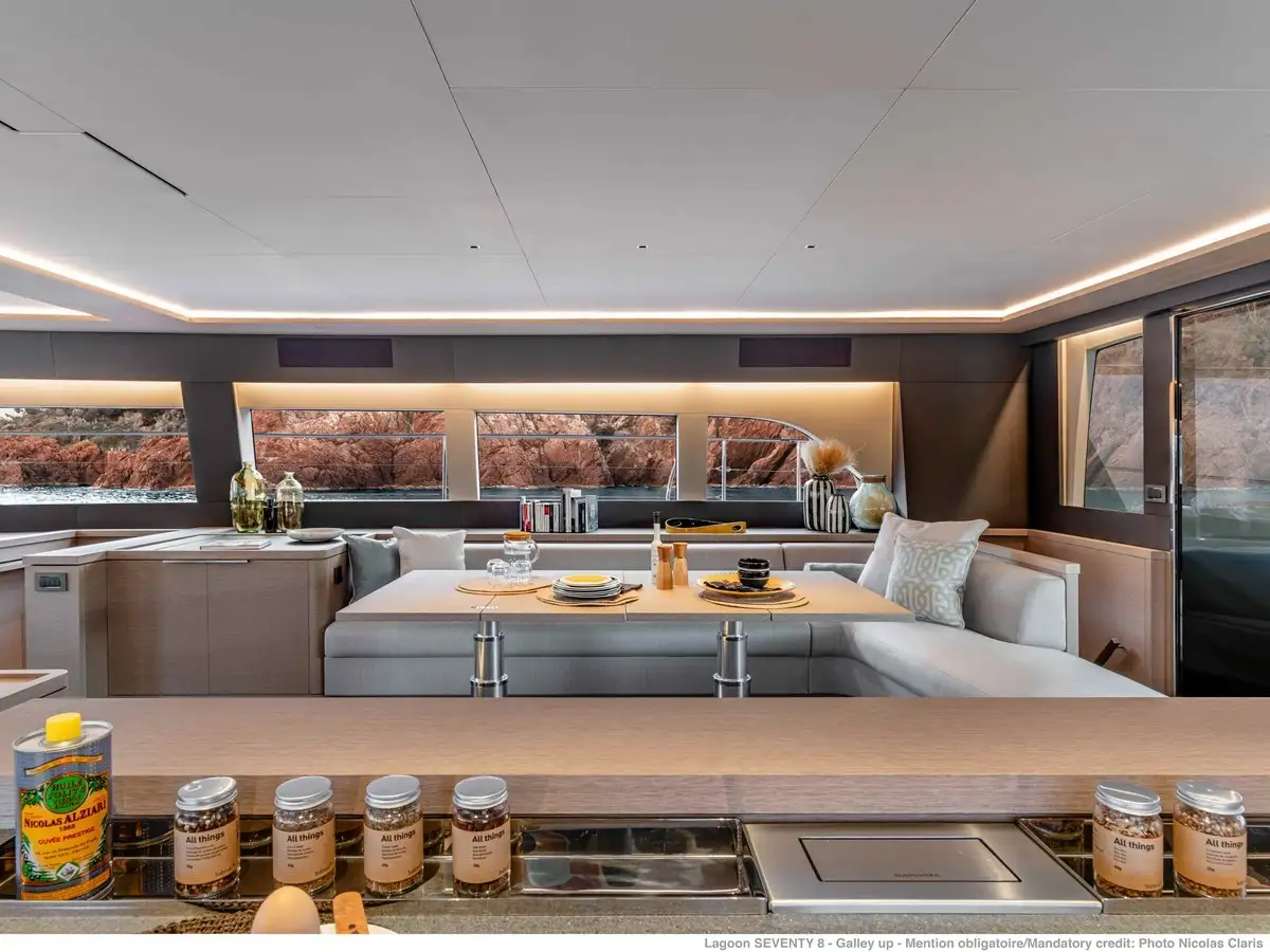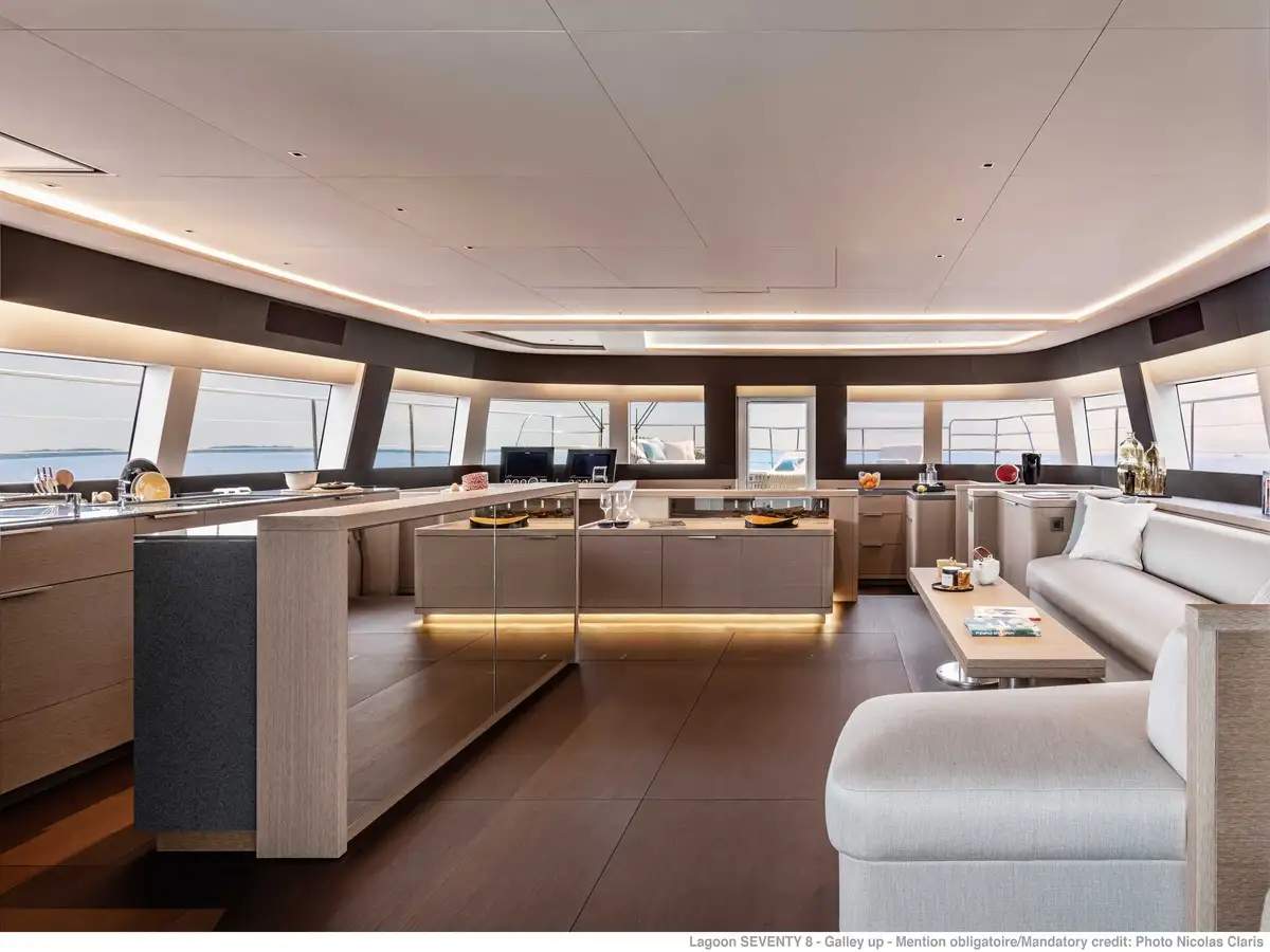 Le SEVENTY 8, nouveau navire amiral, fait sa grande entrée chez Lagoon. Ce yacht de plus de 24 mètres, conçu par les grands noms de l’architecture navale, VPLP, Patrick Le Quément et Nauta Design marque ainsi l’entrée dans un univers de Motor Yacht où luxe et confort sont les maîtres mots. Sa silhouette à l’élégance intemporelle ainsi que les formes harmonieuses de son roof vont de pair avec de grands volumes pour créer un monde sans compromis où le véritable luxe est l’espace.