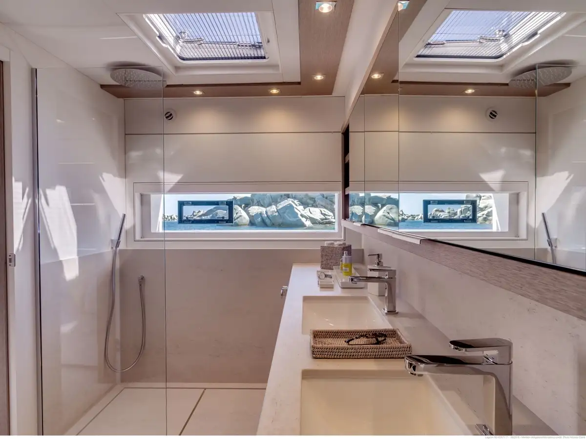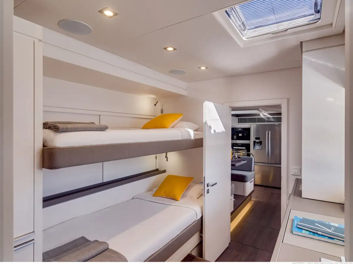 - Un très grand choix d’aménagements pour différents scenarios de vie à bord : jusqu’à cinq cabines équipées chacune d’un lit « Island bed », de nombreux rangements et complétées par une salle de bain privative.