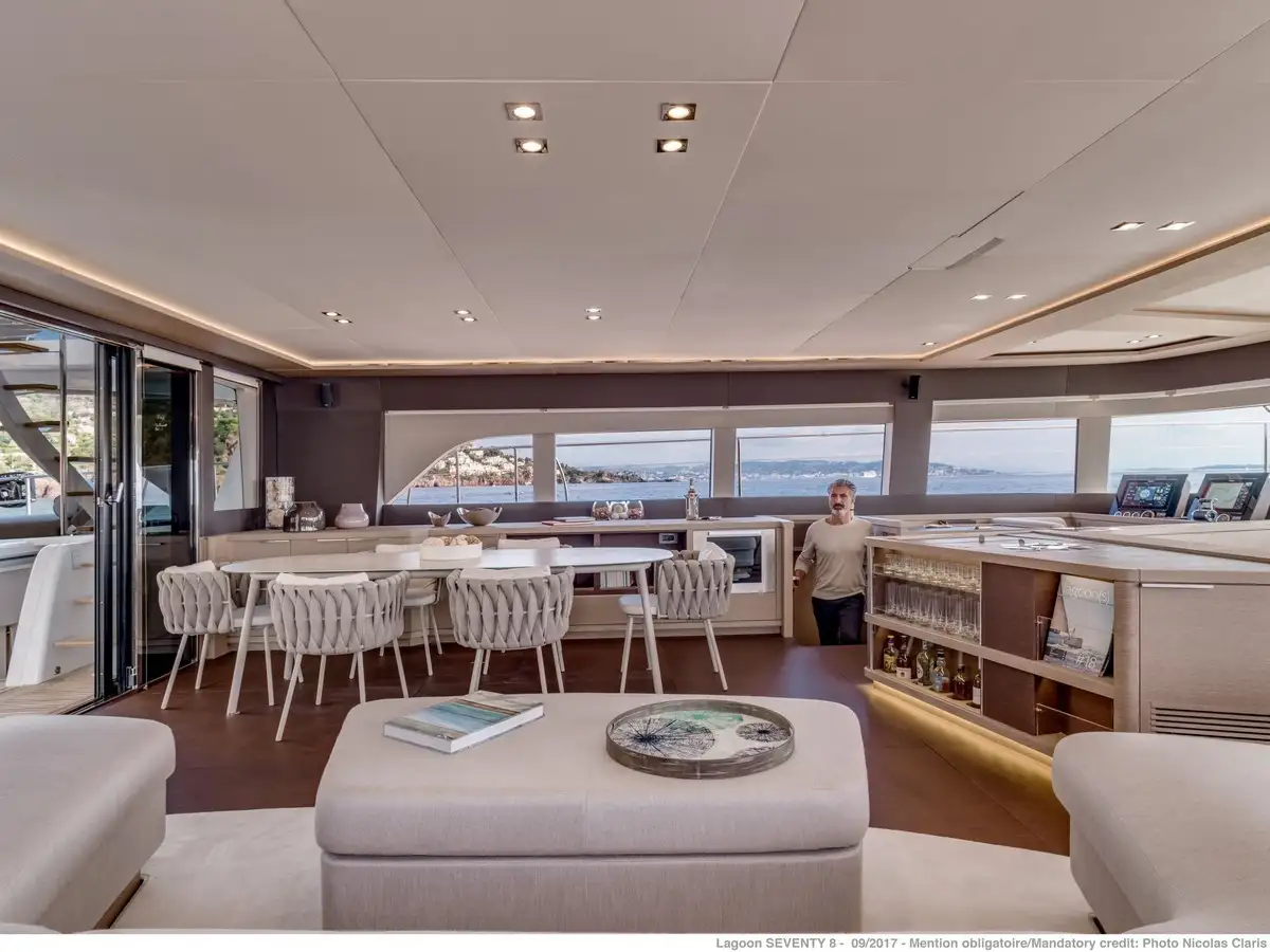 Le SEVENTY 8, nouveau navire amiral, fait sa grande entrée chez Lagoon. Ce yacht de plus de 24 mètres, conçu par les grands noms de l’architecture navale, VPLP, Patrick Le Quément et Nauta Design marque ainsi l’entrée dans un univers de Motor Yacht où luxe et confort sont les maîtres mots. Sa silhouette à l’élégance intemporelle ainsi que les formes harmonieuses de son roof vont de pair avec de grands volumes pour créer un monde sans compromis où le véritable luxe est l’espace.
