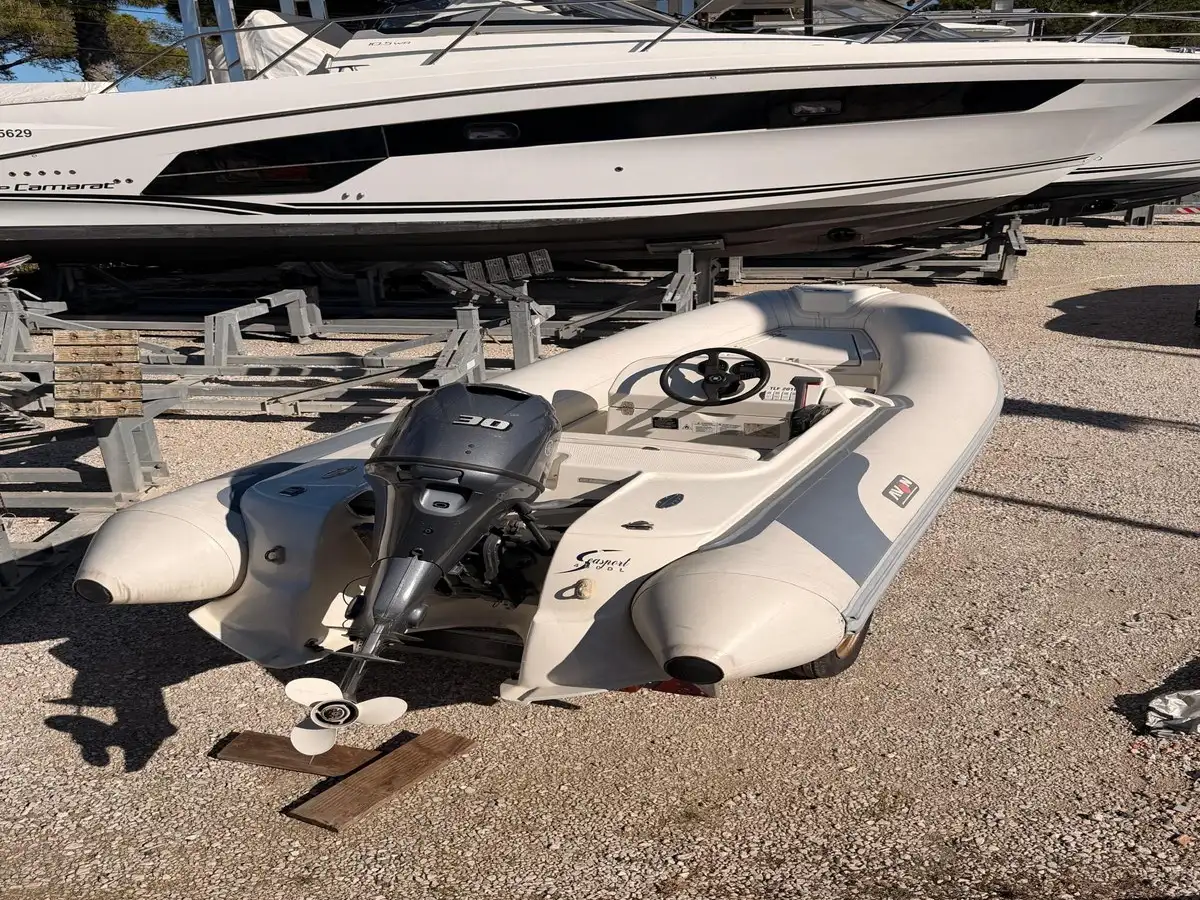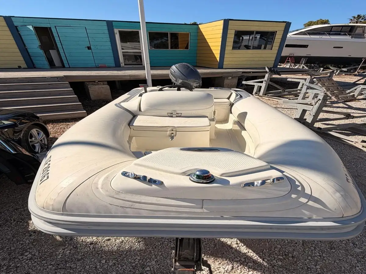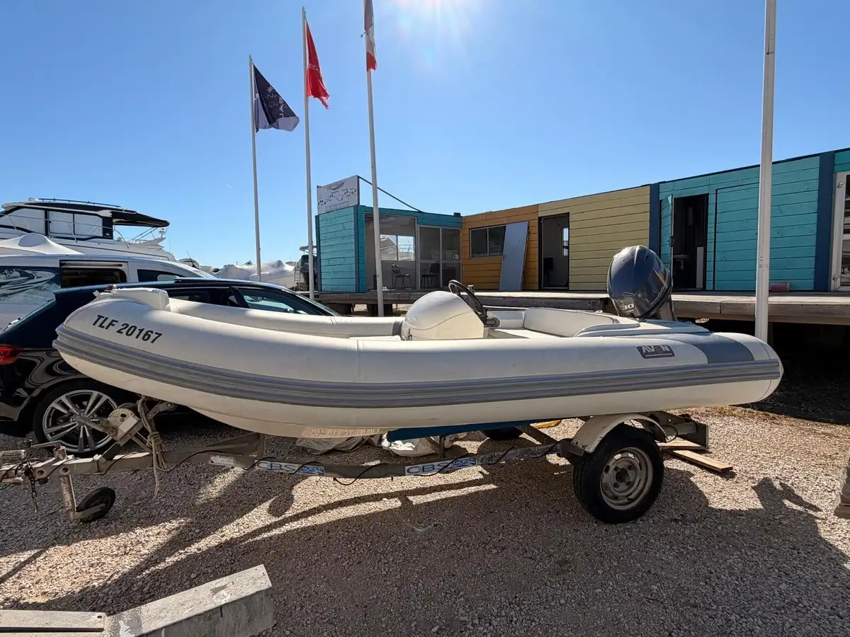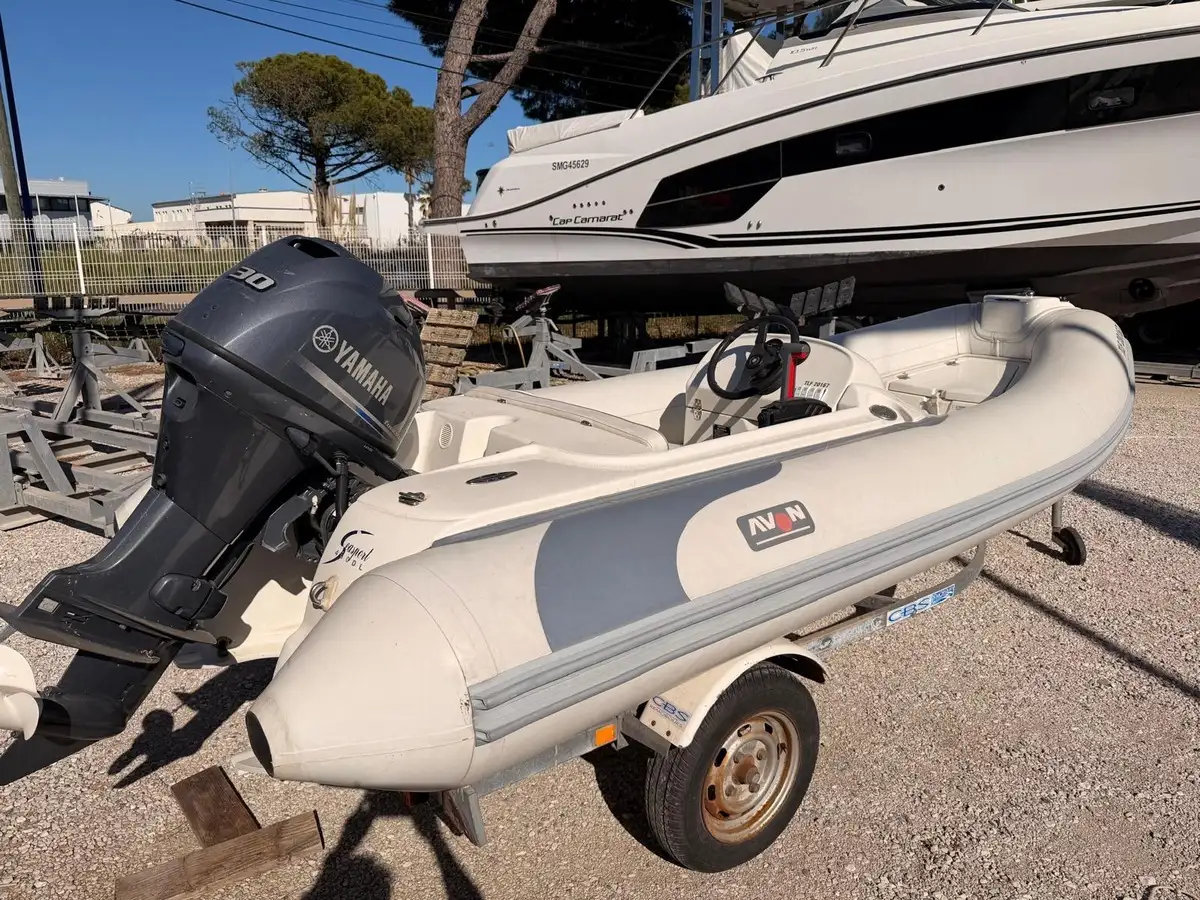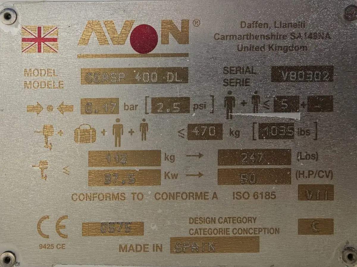 Annexe semi-rigide Avon Seasport 400 DL (série Deluxe), idéale pour servir d'annexe de yacht ou pour des sorties à la journée. Ce modèle est réputé pour sa robustesse, son confort et sa tenue de mer exceptionnelle.