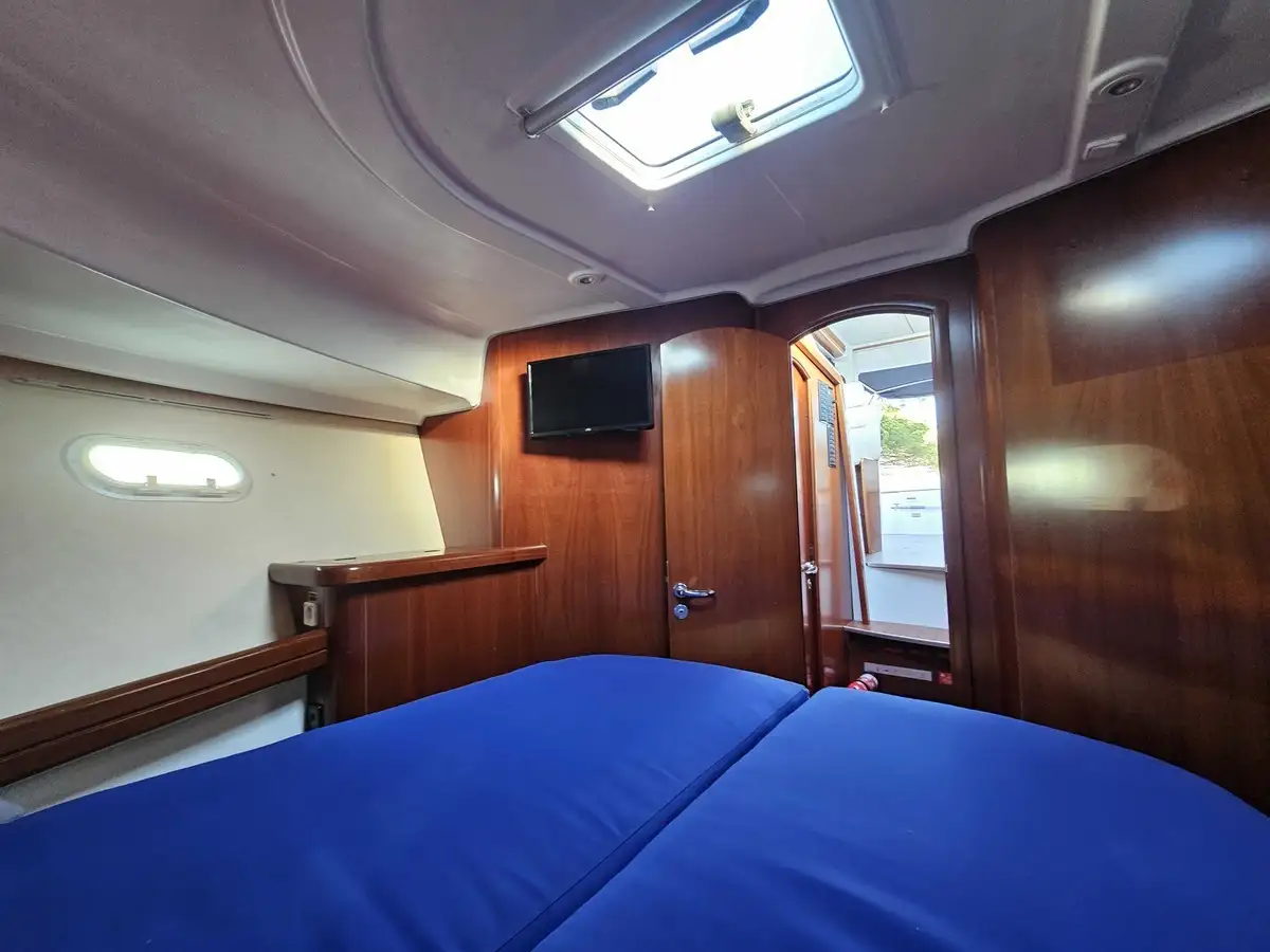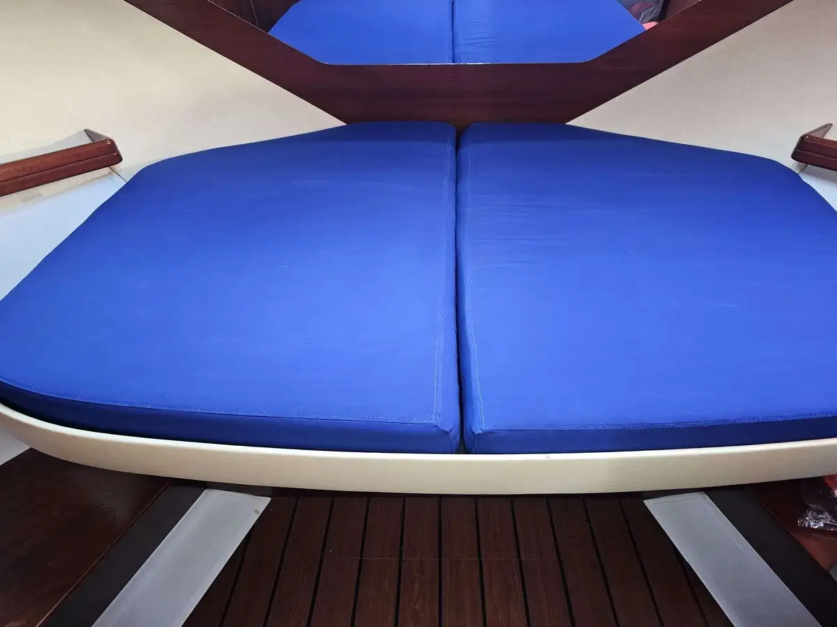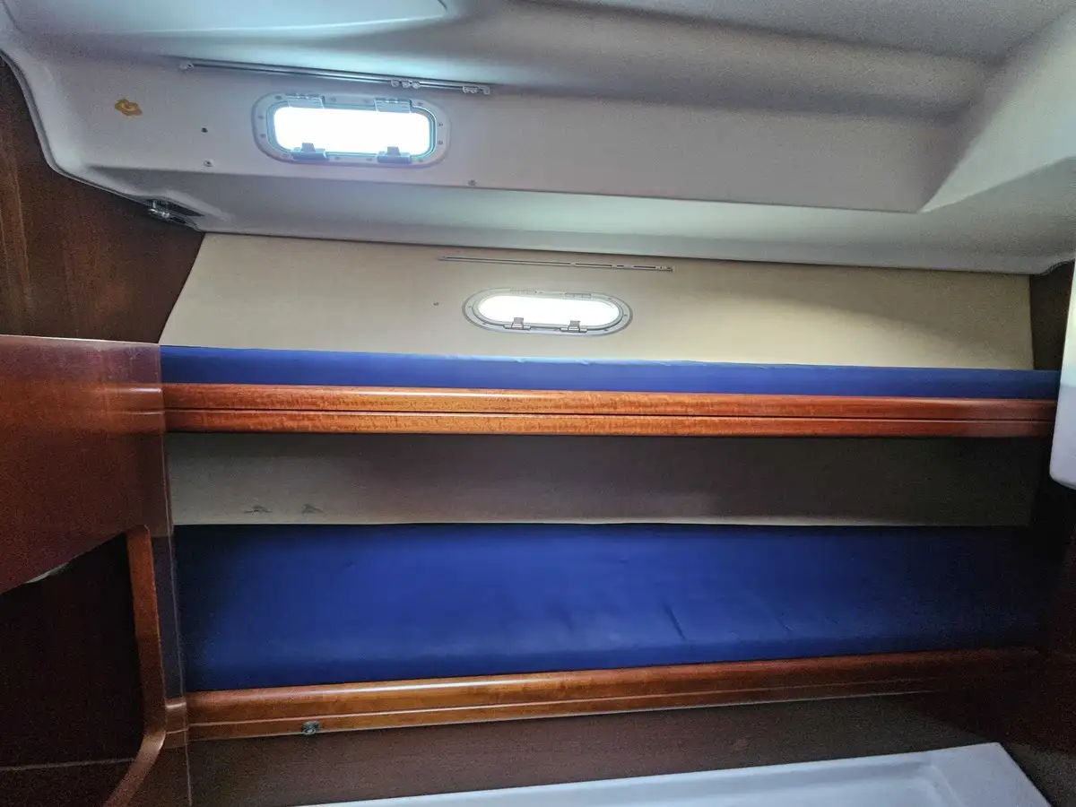 2 separate cabins: An owner's cabin in the bow (double bed) and a guest cabin on the side with two bunk beds.