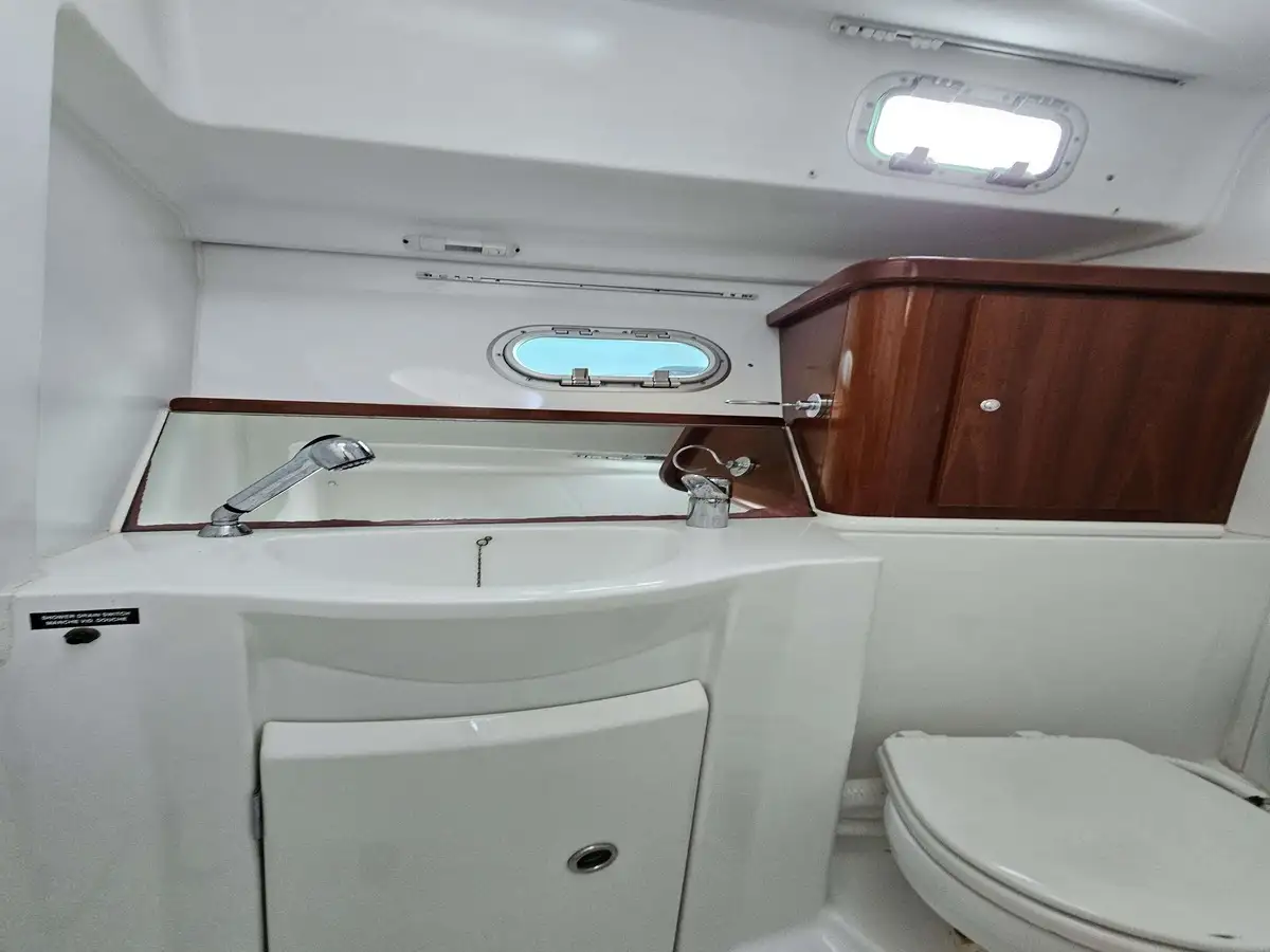 Bathroom: Full bathroom with marine toilet, sink, and shower.
