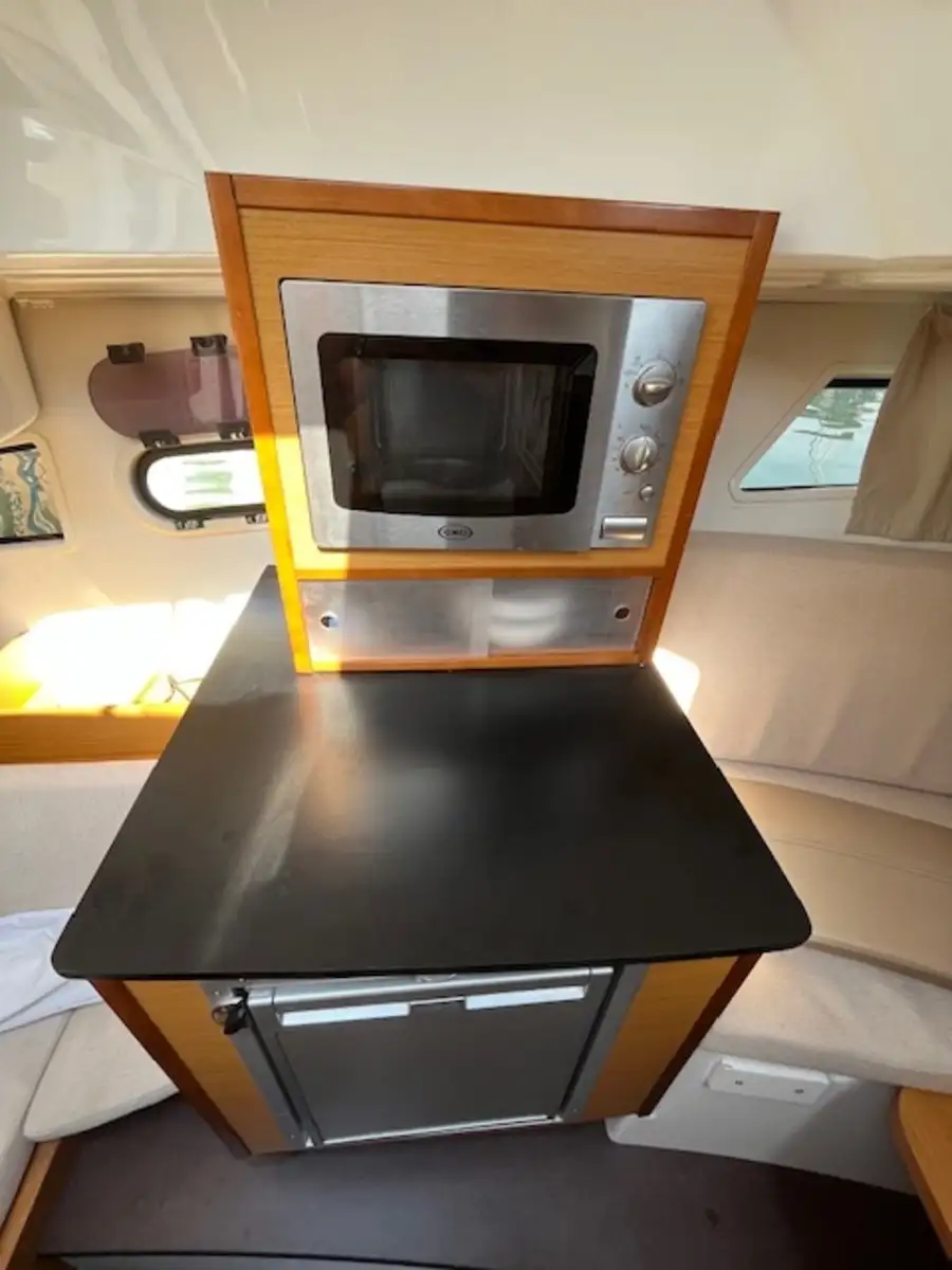 The spacious and versatile cockpit is perfect for hosting friends and family, while the large forward sundeck invites you to relax and enjoy the sun. Inside, the living space is just as impressive, featuring a bright cabin, galley, bathroom with toilet, and double berths—ideal for extending your time on the water over several days.