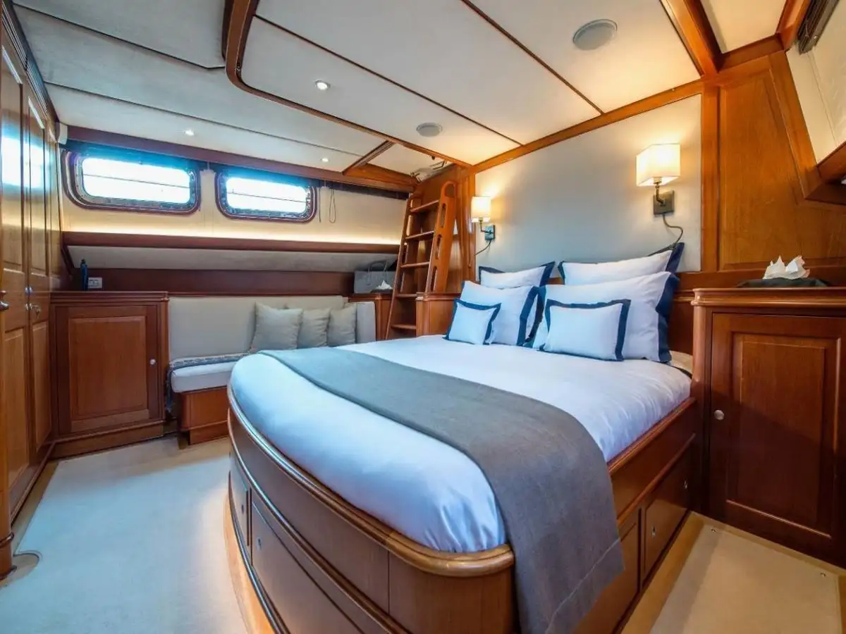 At the rear of the boat, the sleeping area serves 4 sumptuous en suite cabins.