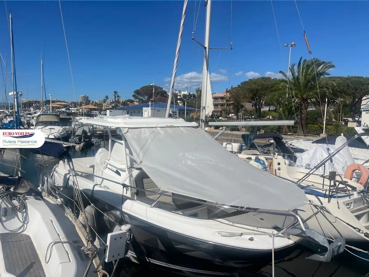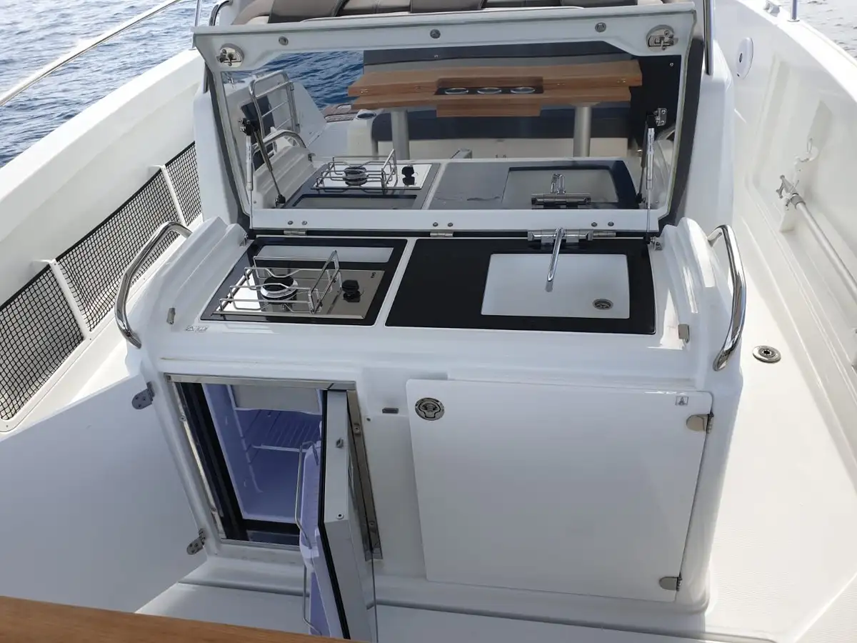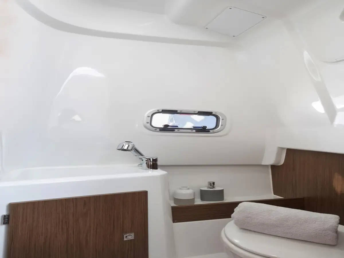 At the bow, a chaise lounge and a convertible seating area create the perfect space for relaxation. The leaning post includes an outdoor kitchen, while dedicated features such as a livewell, rod holders, and ample storage make it an excellent choice for fishing or family leisure. The bright cabin offers a central double bed and an independent bathroom, allowing you to extend your outings with an overnight stay on board.