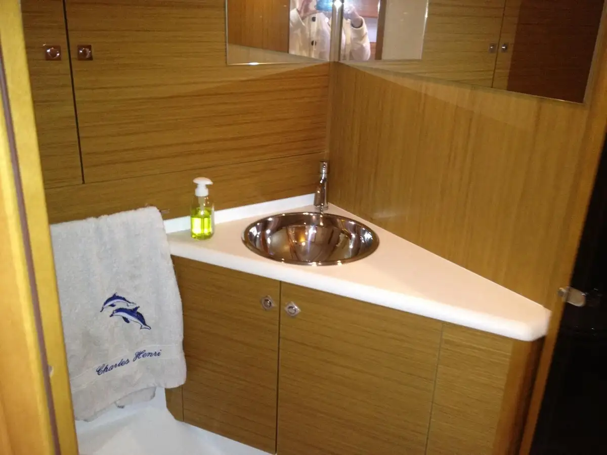 Ce modèle 3 cabines de 2010, présenté en très bel état, séduit par son ambiance marine raffinée, ses boiseries claires et sa luminosité remarquable. Les espaces intérieurs, modernes et parfaitement agencés, offrent un confort premium, particulièrement dans la cabine propriétaire, spacieuse et élégante, véritable suite dédiée au bien-être en navigation comme au mouillage.