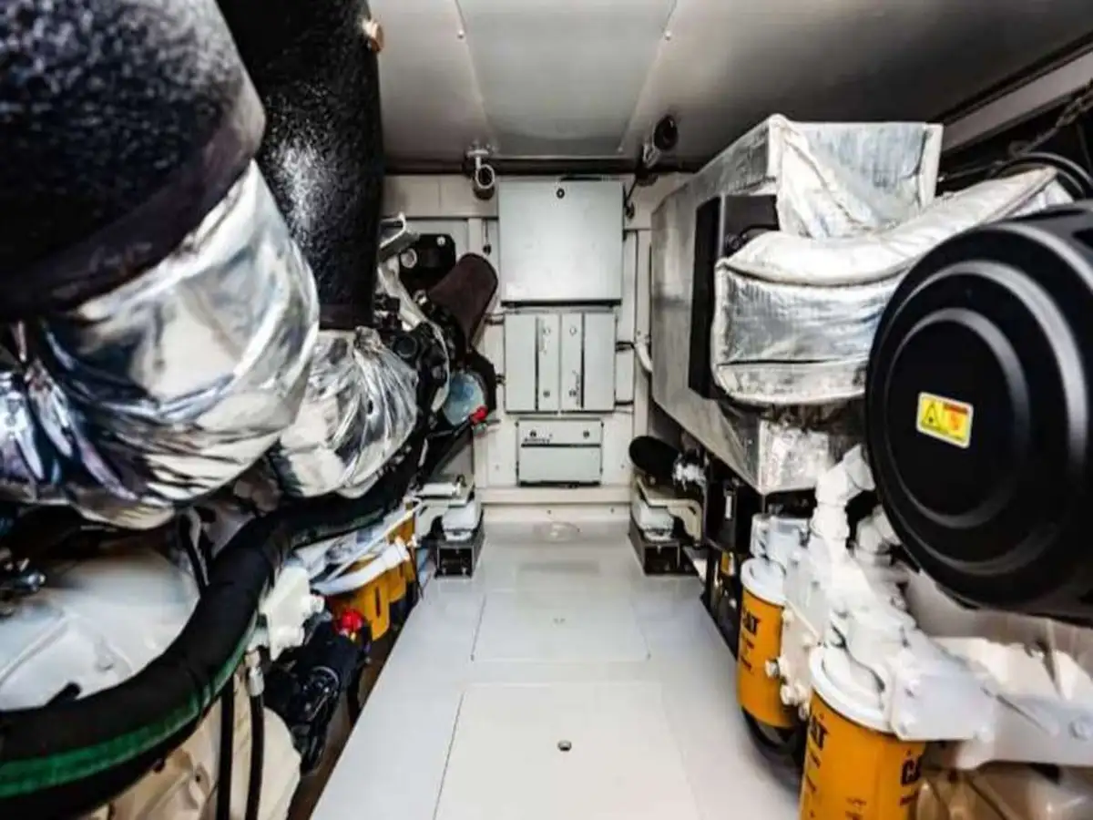 The boat is powered by 2 CAT C18 engines of 1150 hp, clocking up only 503 hours, allowing her to reach a top speed of 32 knots, without forgetting the comfort and serenity offered at 28 knots of cruising speed.
