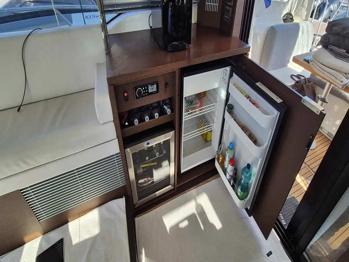The interior features a spacious salon and two beautifully appointed cabins, bright and generous in volume, offering perfect comfort for you and your guests during your cruises.