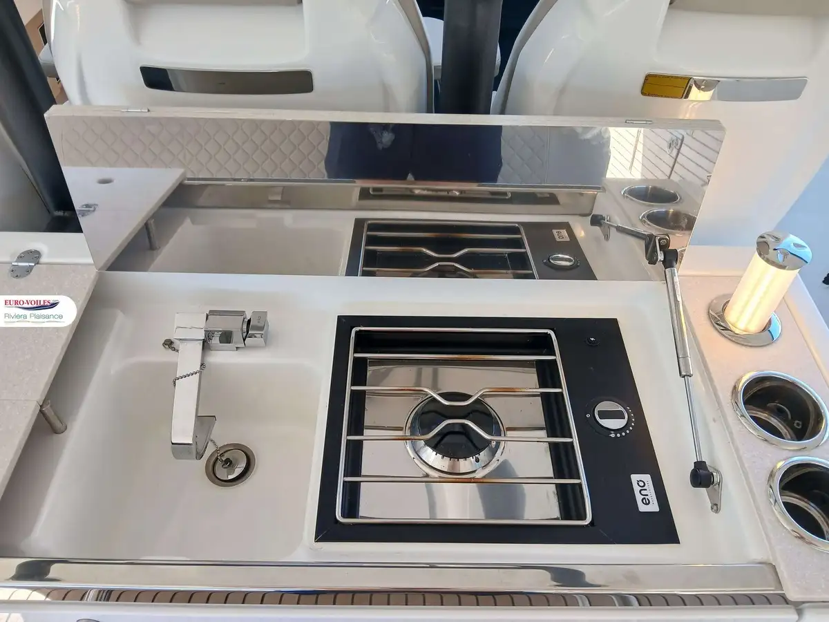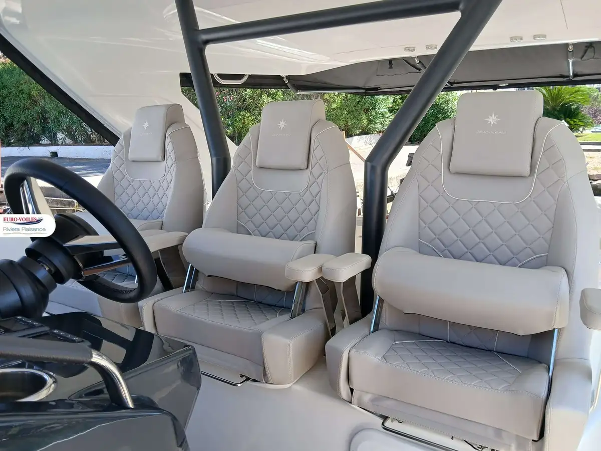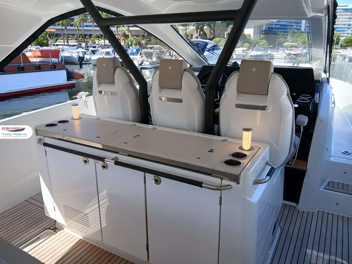 The bright and refined interior features a superb master cabin, a guest cabin, a modern bathroom, and a fully equipped breakfast point. Details such as teak finishes, Macadamia White upholstery, enclosure covers, and premium packs reflect the meticulous attention to comfort and conviviality.