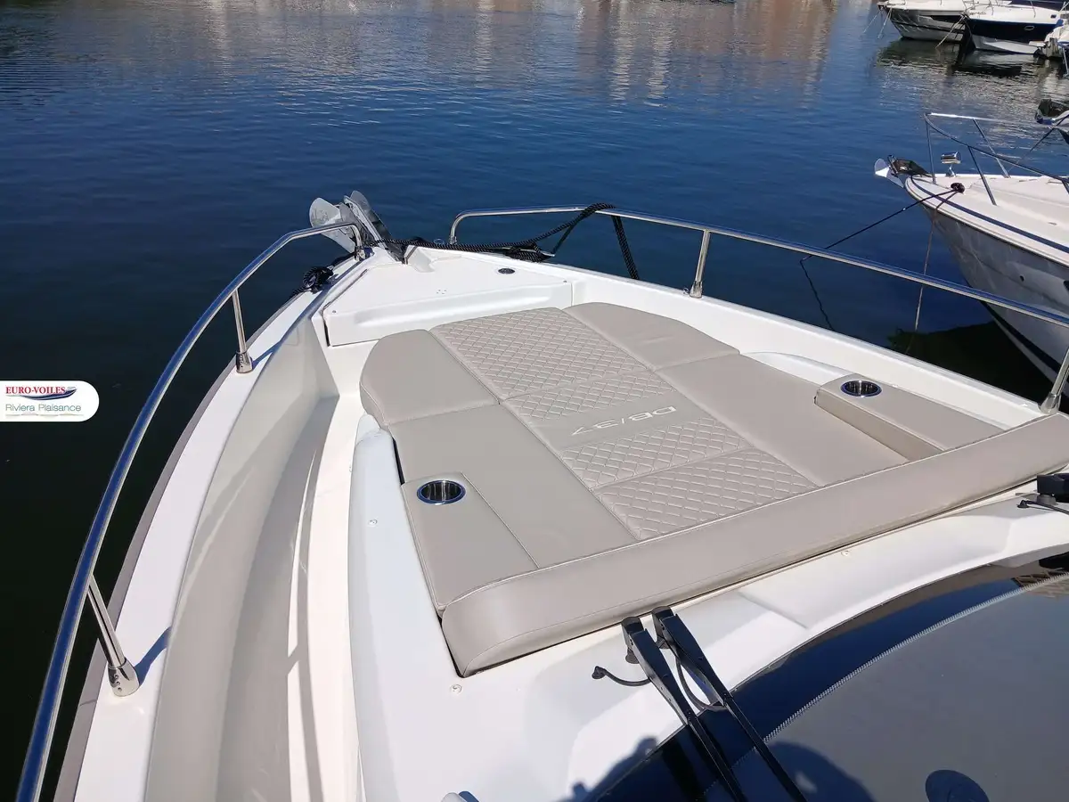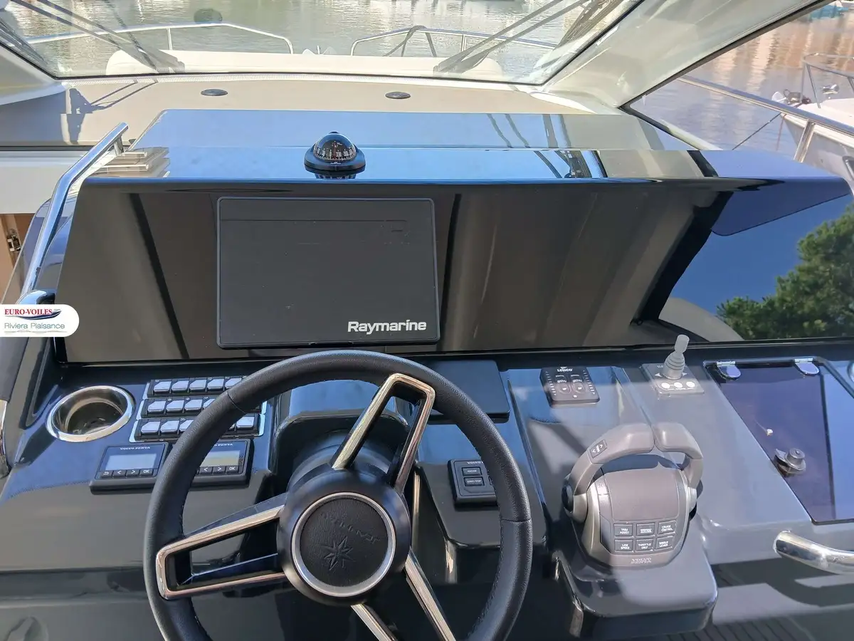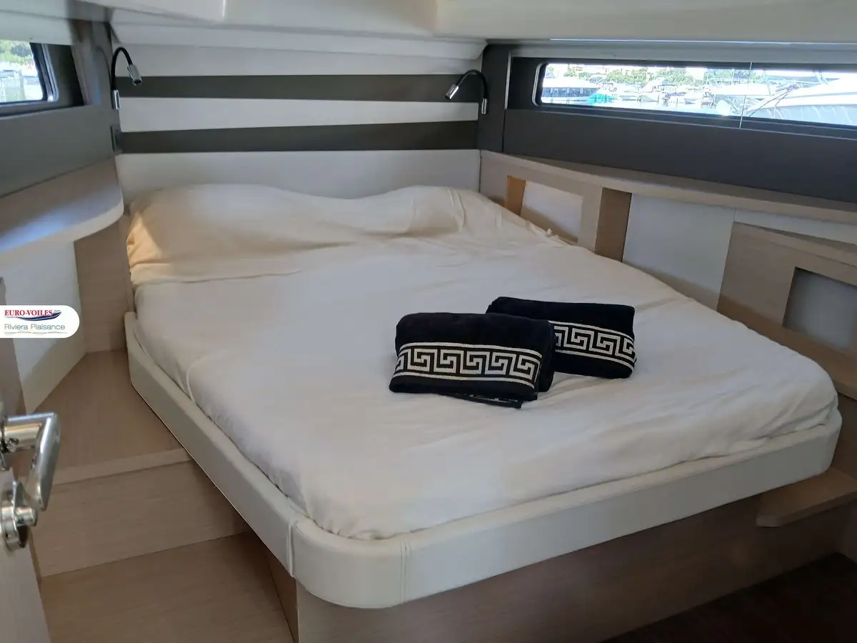The bright and refined interior features a superb master cabin, a guest cabin, a modern bathroom, and a fully equipped breakfast point. Details such as teak finishes, Macadamia White upholstery, enclosure covers, and premium packs reflect the meticulous attention to comfort and conviviality.
