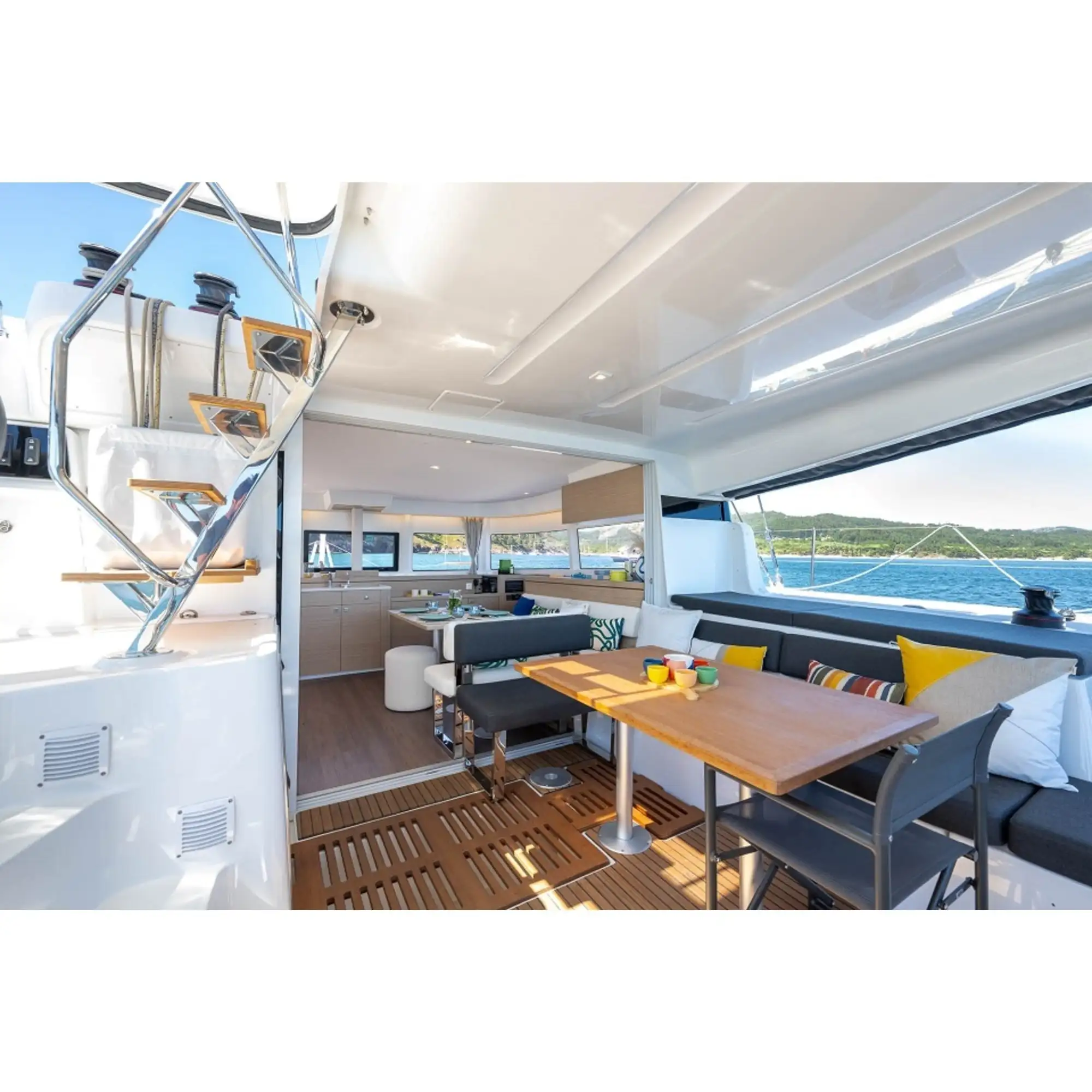 Conçu pour être adaptable, il innove par son habitabilité grâce à sa nouvelle carène, offrant encore plus de confort, une ouverture supplémentaire au niveau de l’arrière des coques. Cette solution innovante facilite la circulation entre le bateau et le quai, alliant sécurité et confort, dans un souci de bien-être à bord.